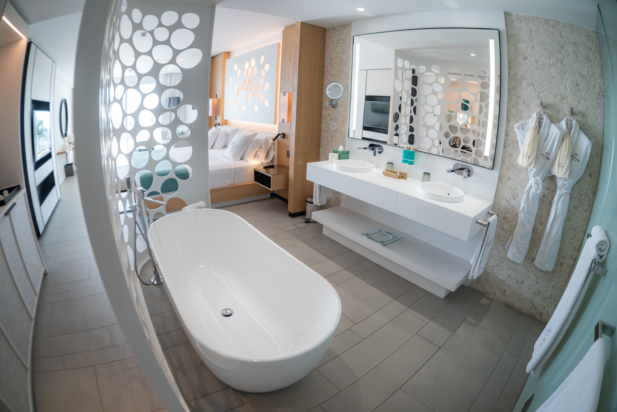 La suite cuenta con una cama iluminada “KING SIZE” y un baño con doble lavabo y bañera de KRION. Una ducha muy espaciosa y aseo separado.