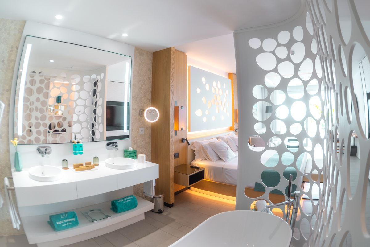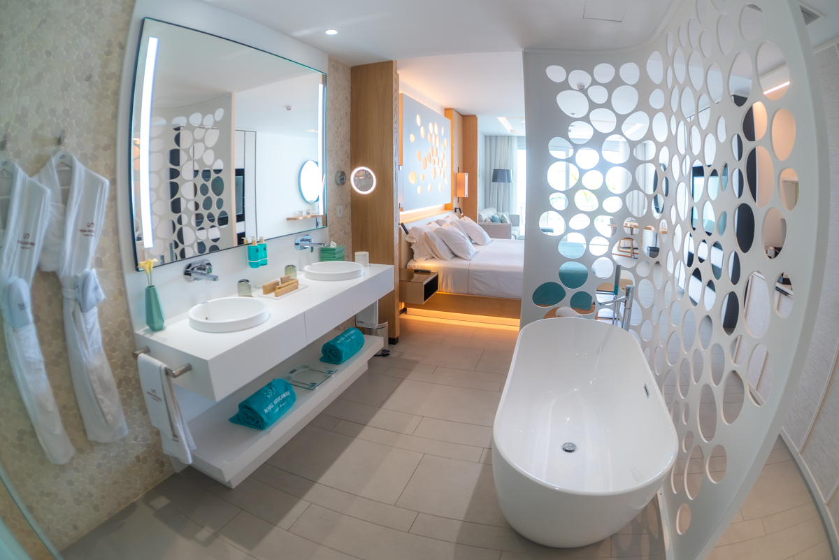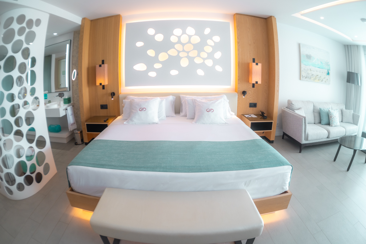 La suite cuenta con una cama iluminada “KING SIZE” y un baño con doble lavabo y bañera de KRION. Una ducha muy espaciosa y aseo separado.