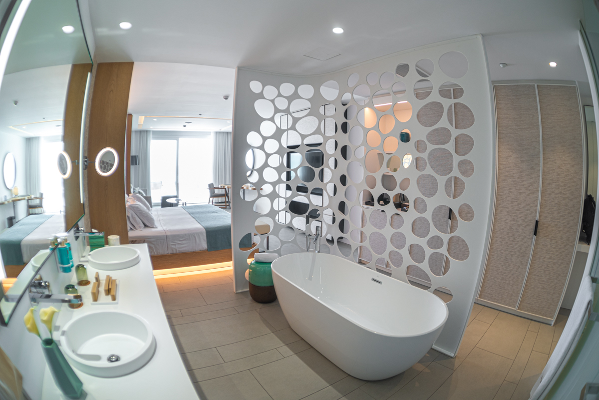 La suite cuenta con una cama iluminada “KING SIZE” y un baño con doble lavabo y bañera de KRION. Una ducha muy espaciosa y aseo separado.