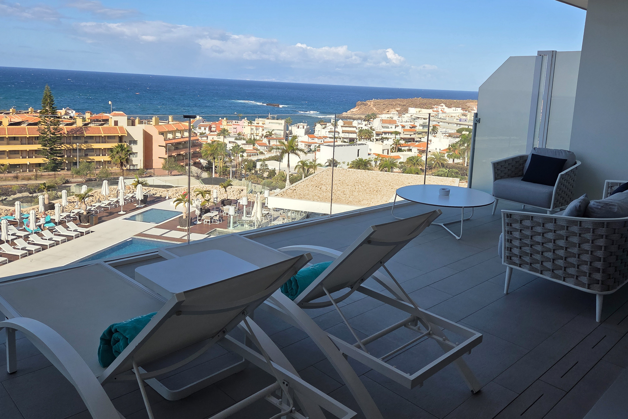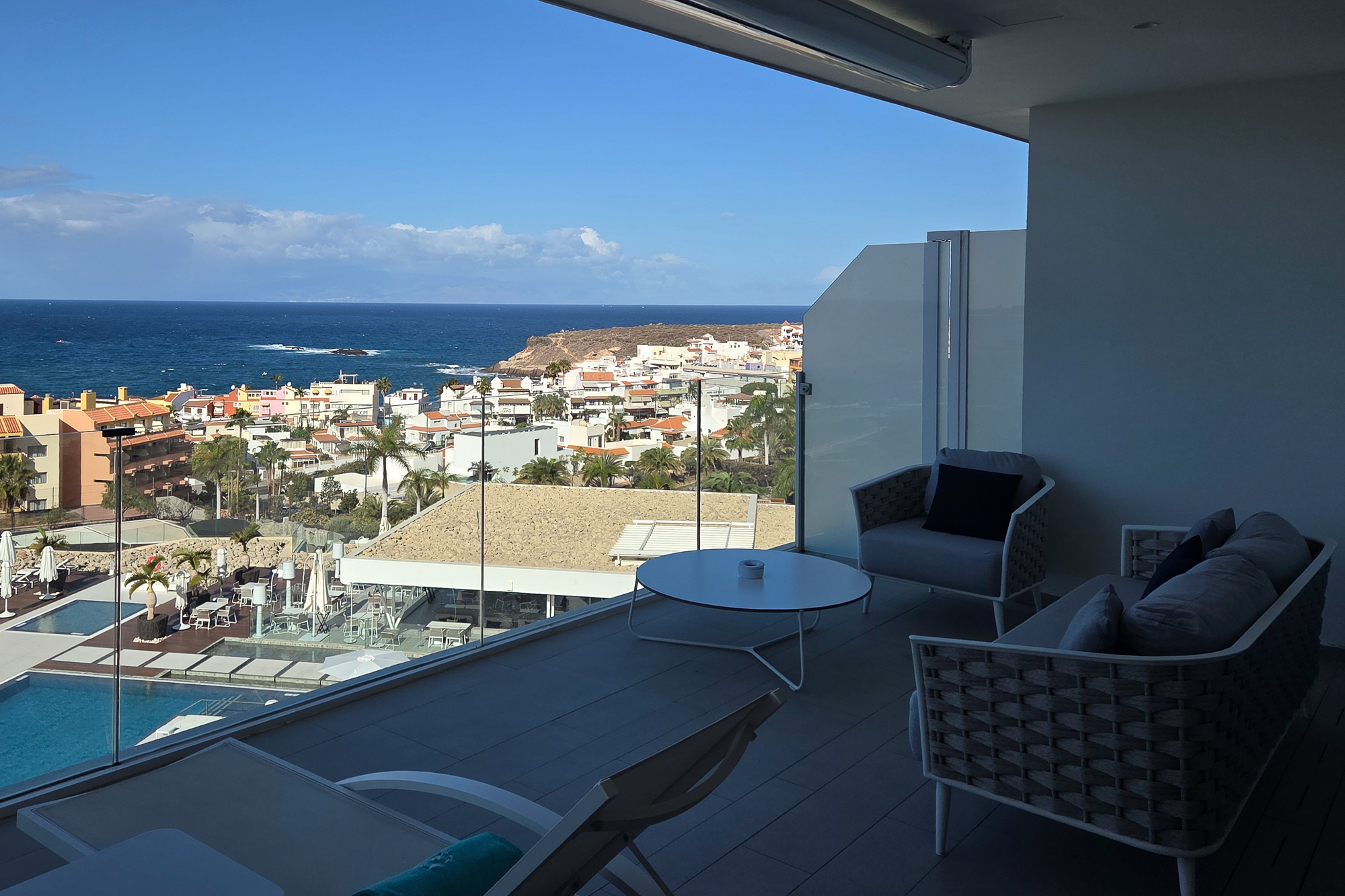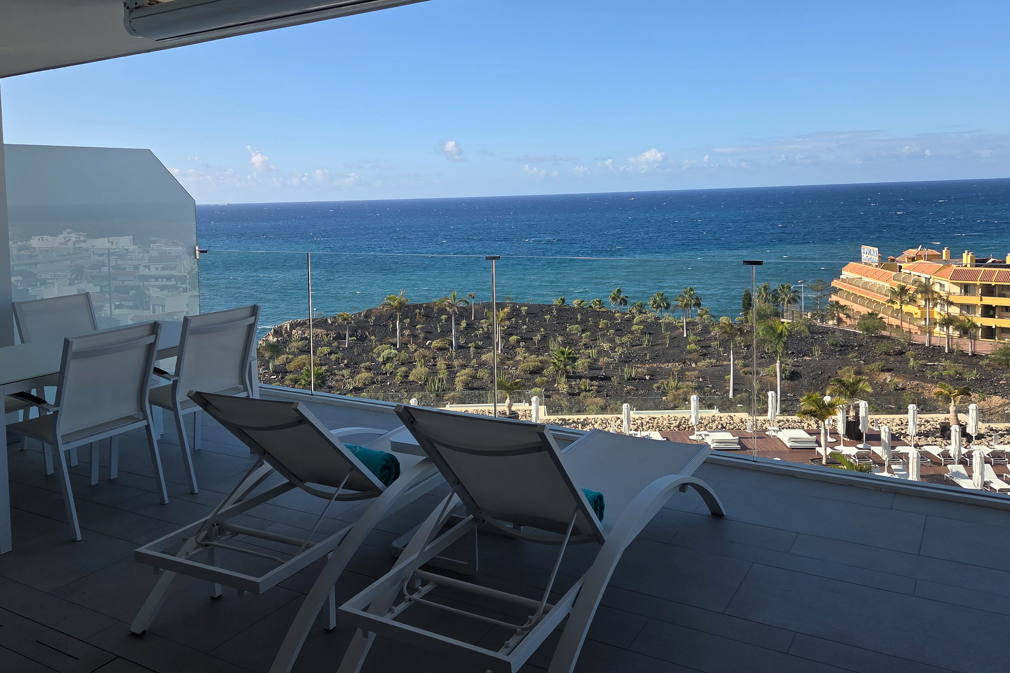 Grote schuiframen geven direct toegang tot een ruim privéterras met uitzicht op de Atlantische Oceaan. Het terras is ingericht met een loungegedeelte, ligbedden en een eettafel, waardoor het de perfecte plek is om te ontspannen in de zon, buiten te dineren of simpelweg te genieten van de zeebries en het uitzicht.