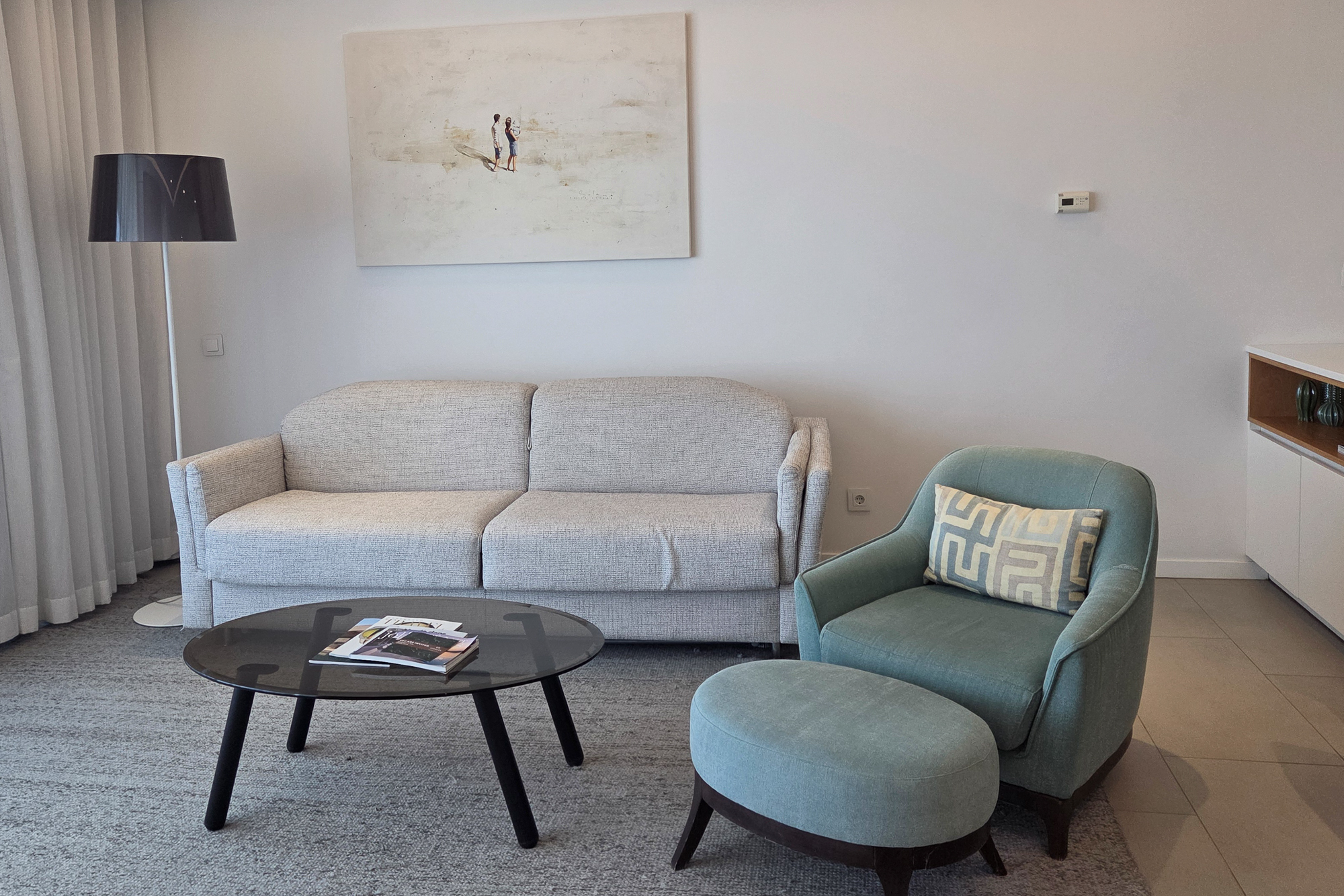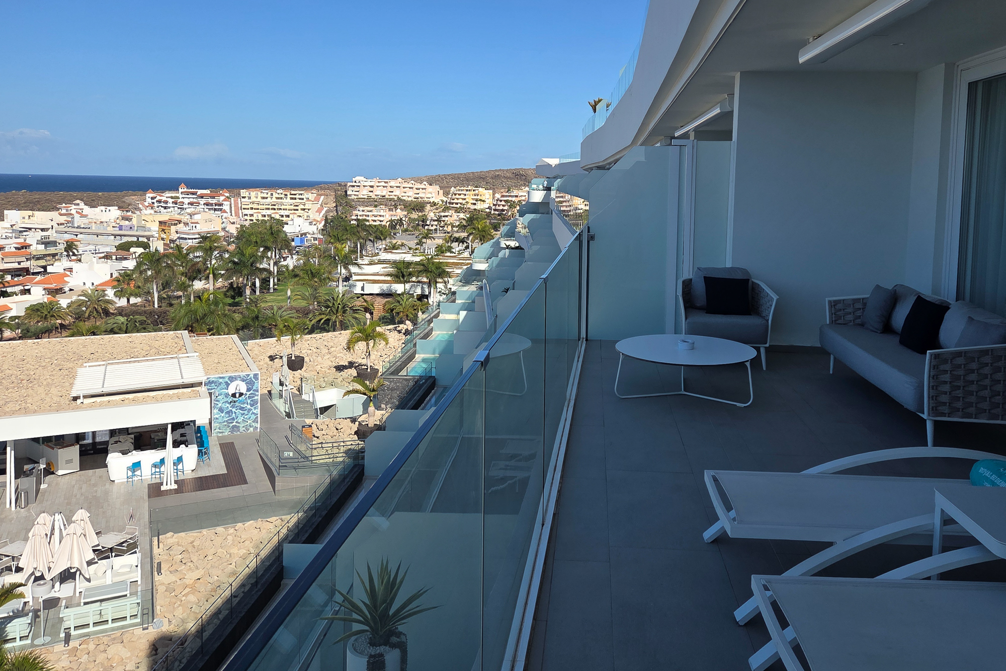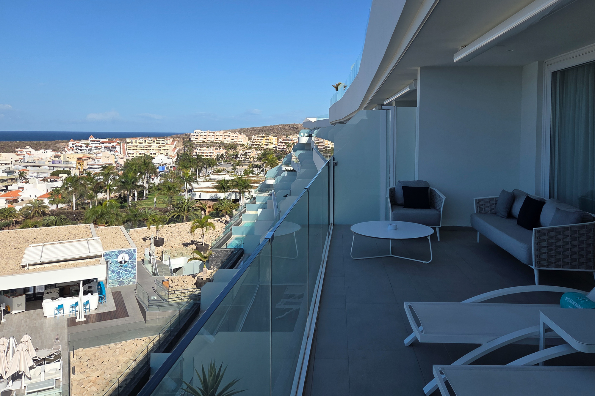 Grote schuiframen geven direct toegang tot een ruim privéterras met uitzicht op de Atlantische Oceaan. Het terras is ingericht met een loungegedeelte, ligbedden en een eettafel, waardoor het de perfecte plek is om te ontspannen in de zon, buiten te dineren of simpelweg te genieten van de zeebries en het uitzicht.