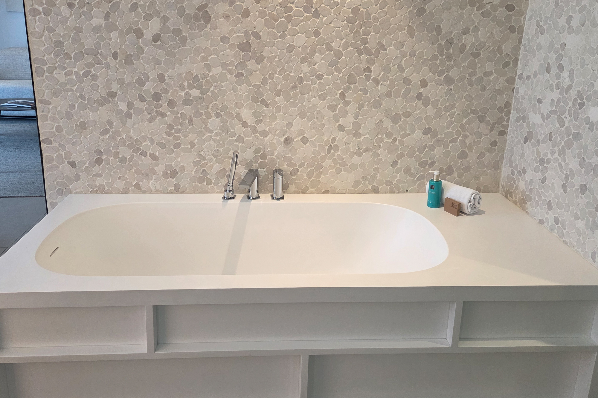 De slaapkamer is ontworpen voor rust en privacy en beschikt over een comfortabel kingsize bed, ingebouwde kasten en directe toegang tot het terras via grote schuifdeuren die veel natuurlijk licht binnenlaten. De ruime badkamer is afgewerkt met hoogwaardige materialen en beschikt over een ligbad, een inloopdouche en een dubbele wastafel, wat zorgt voor een luxueuze spa-achtige sfeer. Bij de ingang bevindt zich bovendien een aparte wasruimte met wasmachine en droger, ideaal voor langere verblijven.