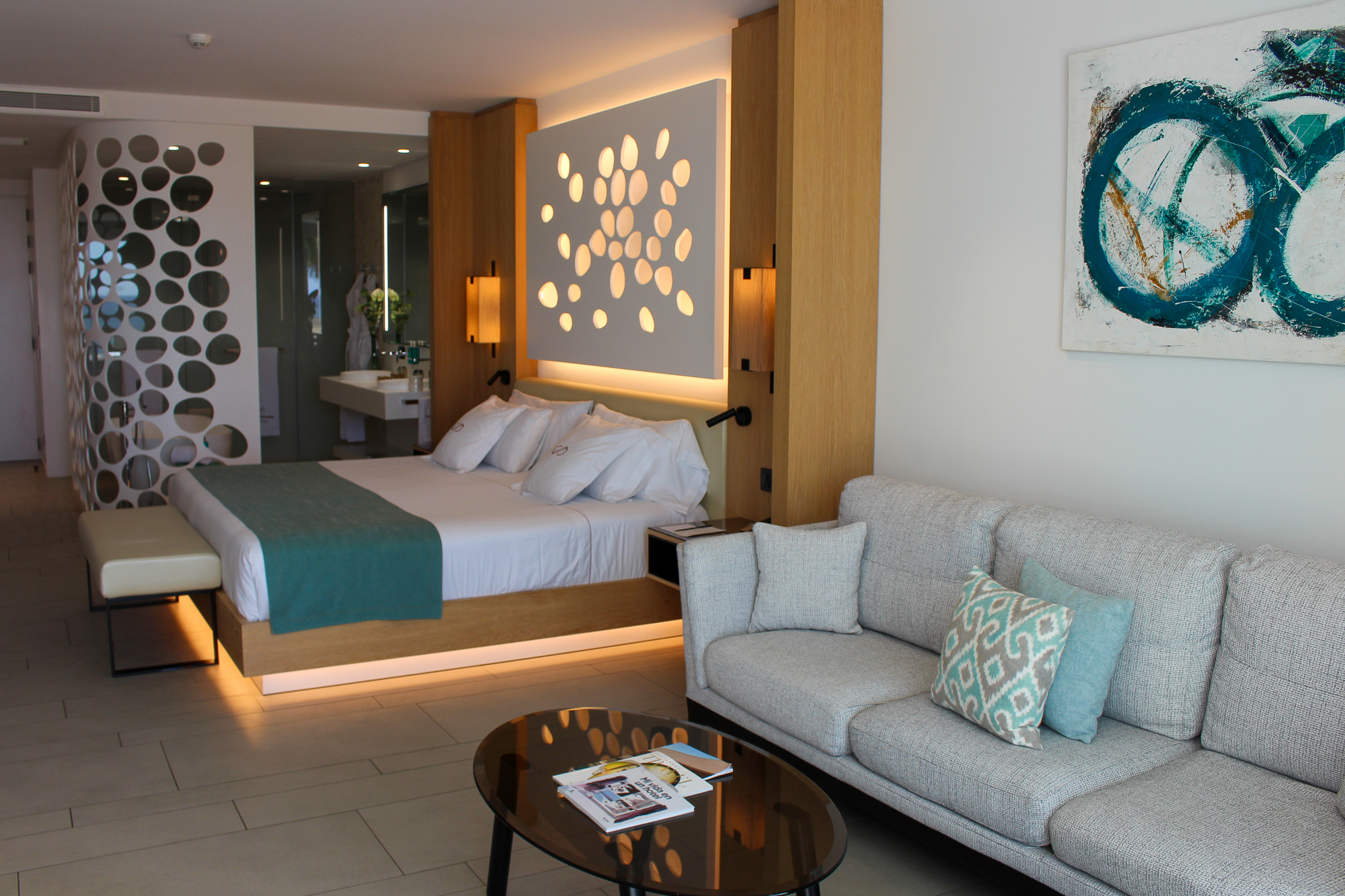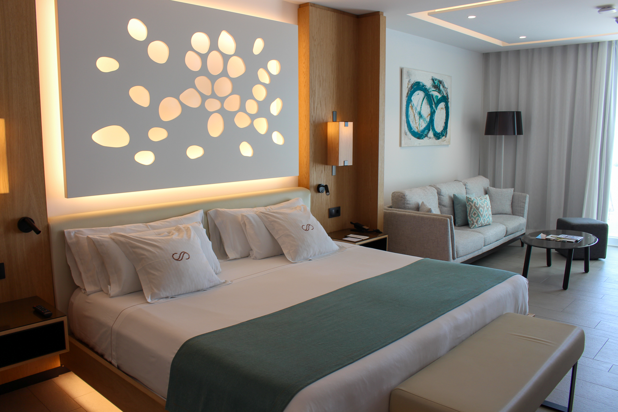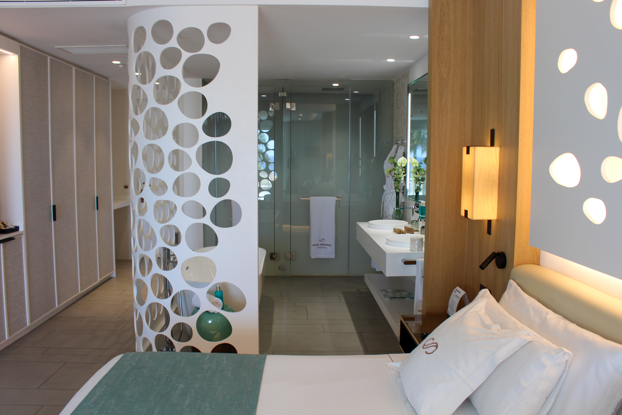 De suite beschikt over een groot verlicht KING SIZE-bed met een mooi ontworpen hoofdbord en een zeer moderne badkamer met dubbele wastafel en een ligbad van KRION. Er is een aparte regendouche en een afzonderlijk toilet. De JS is voorzien van individueel ingebouwde airconditioning.