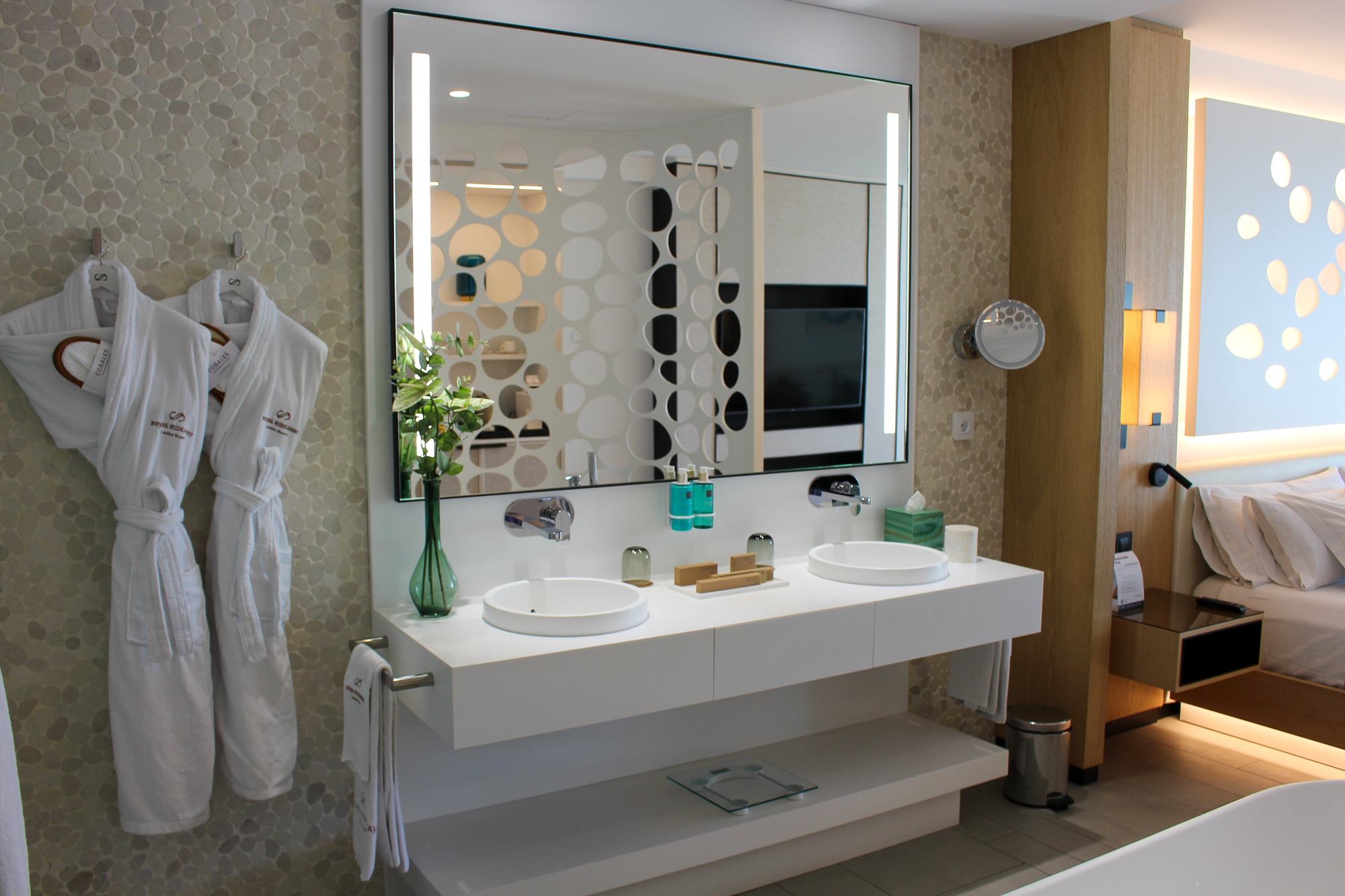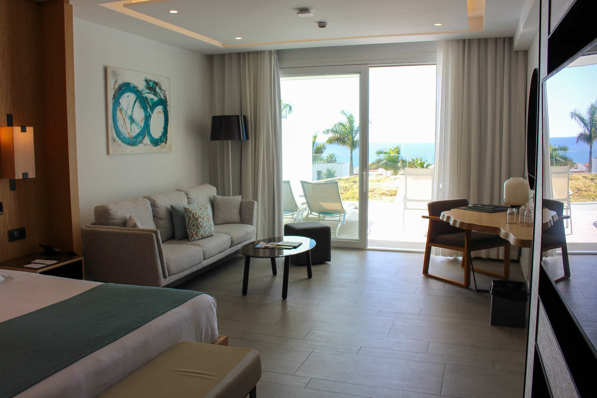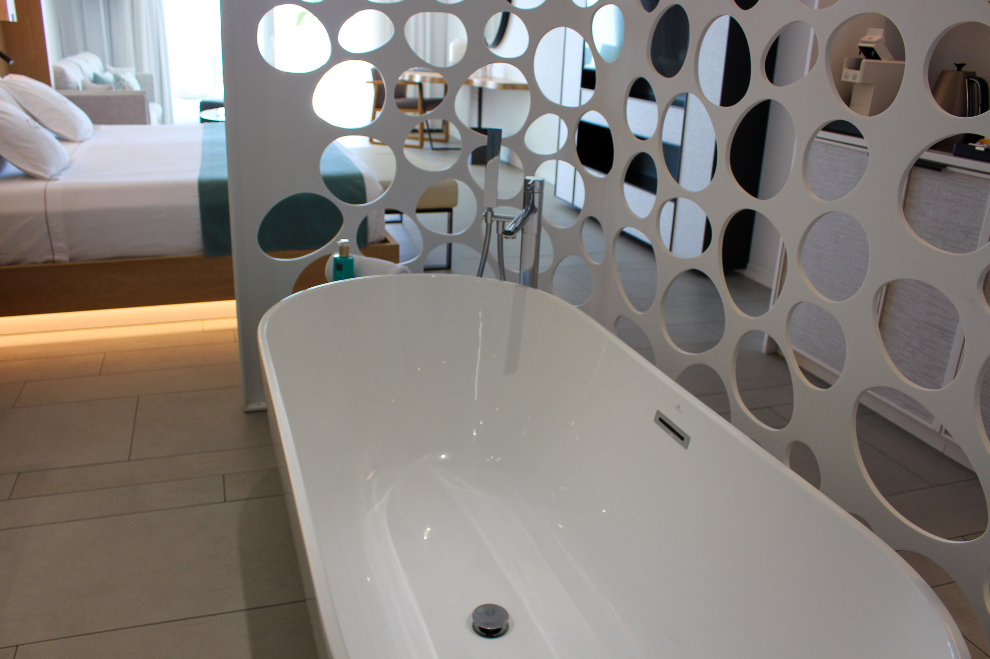 De suite beschikt over een groot verlicht KING SIZE-bed met een mooi ontworpen hoofdbord en een zeer moderne badkamer met dubbele wastafel en een ligbad van KRION. Er is een aparte regendouche en een afzonderlijk toilet. De JS is voorzien van individueel ingebouwde airconditioning.