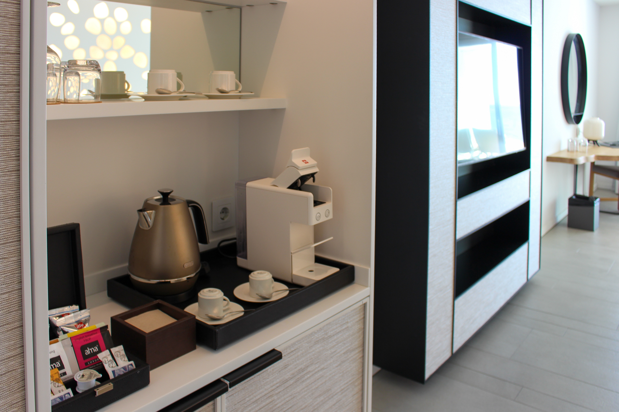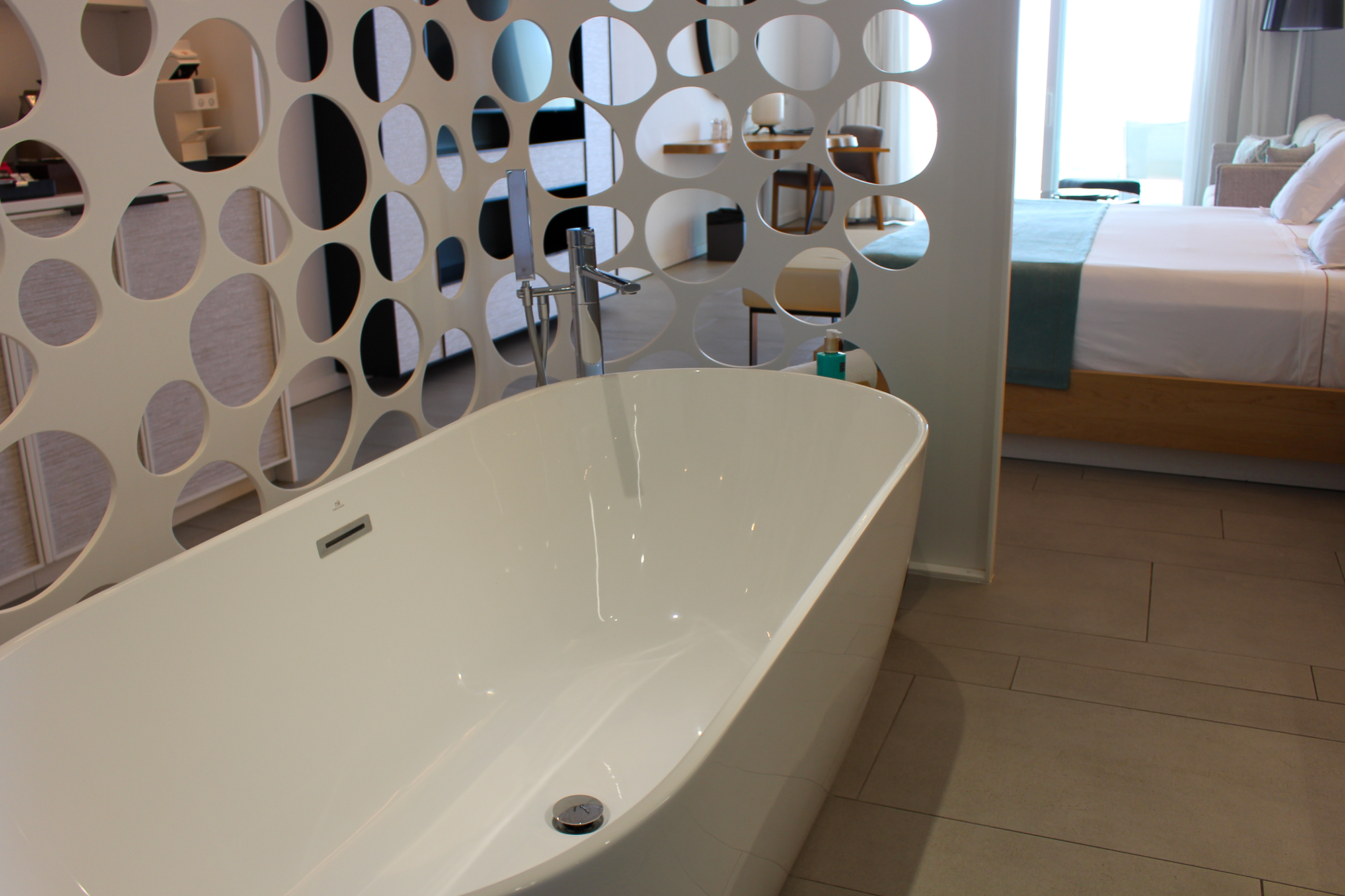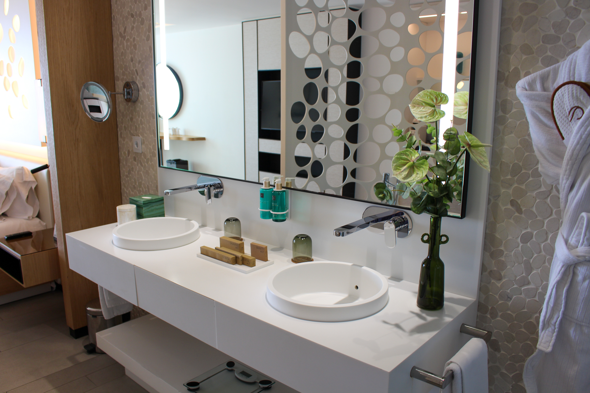 Alle gebruikte materialen en meubels zijn van uitzonderlijk hoge kwaliteit; de suite is licht en de sfeerverlichting zorgt ’s avonds voor een warme, gezellige ambiance.