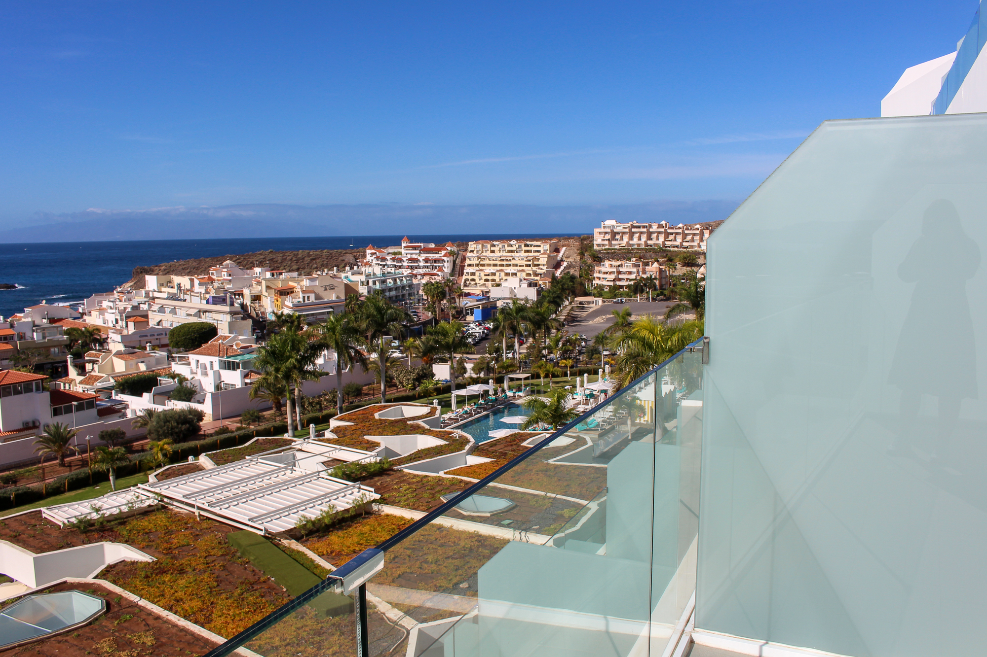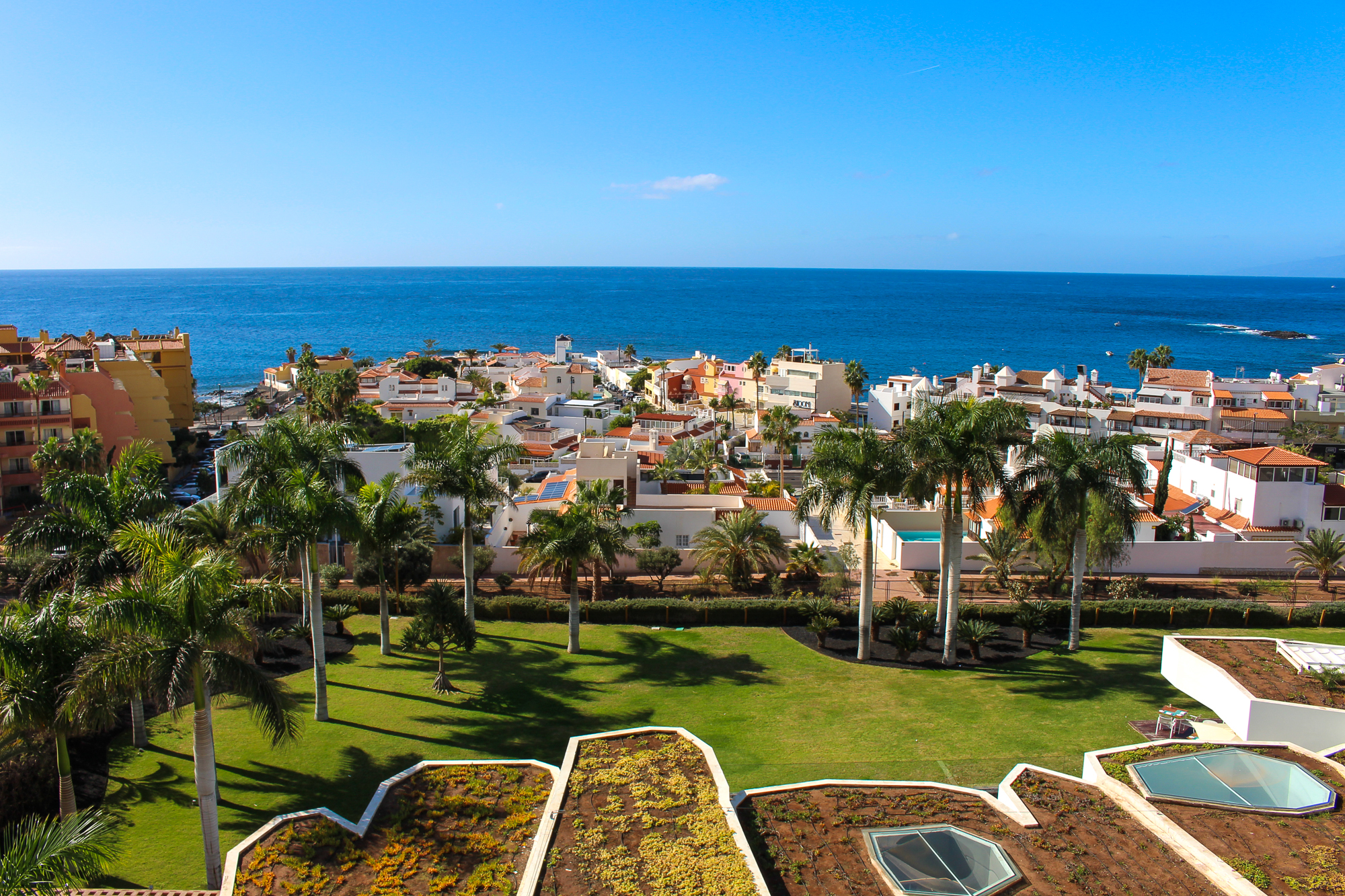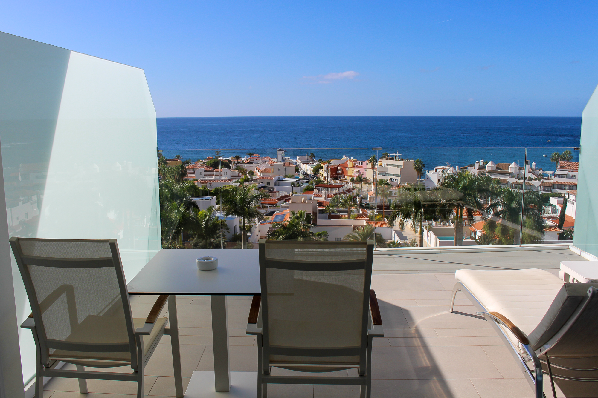 Buiten bevindt zich een zonnig terras met een adembenemend frontaal uitzicht op La Caleta en de uitgestrekte oceaan — het perfecte geheel.