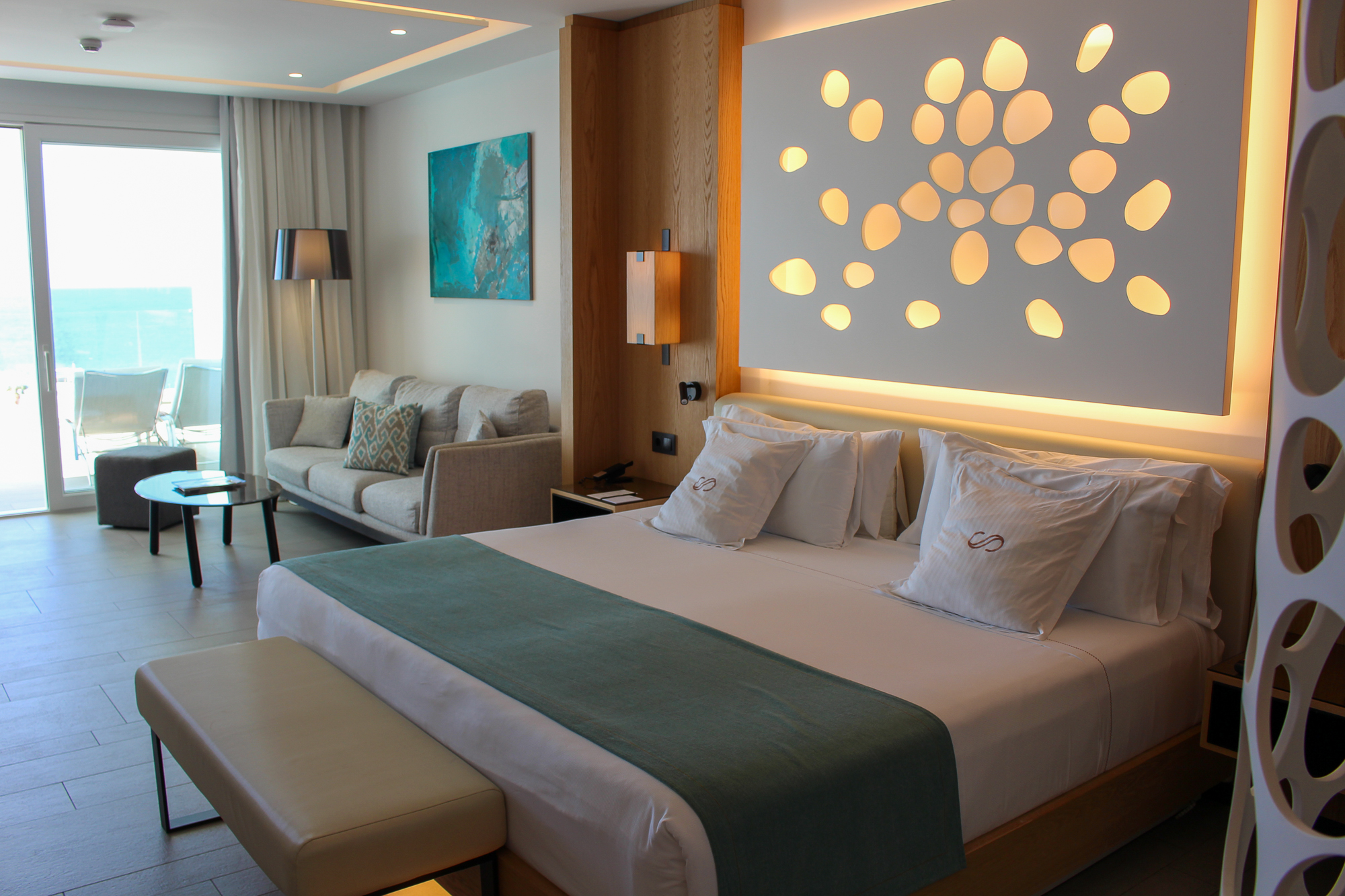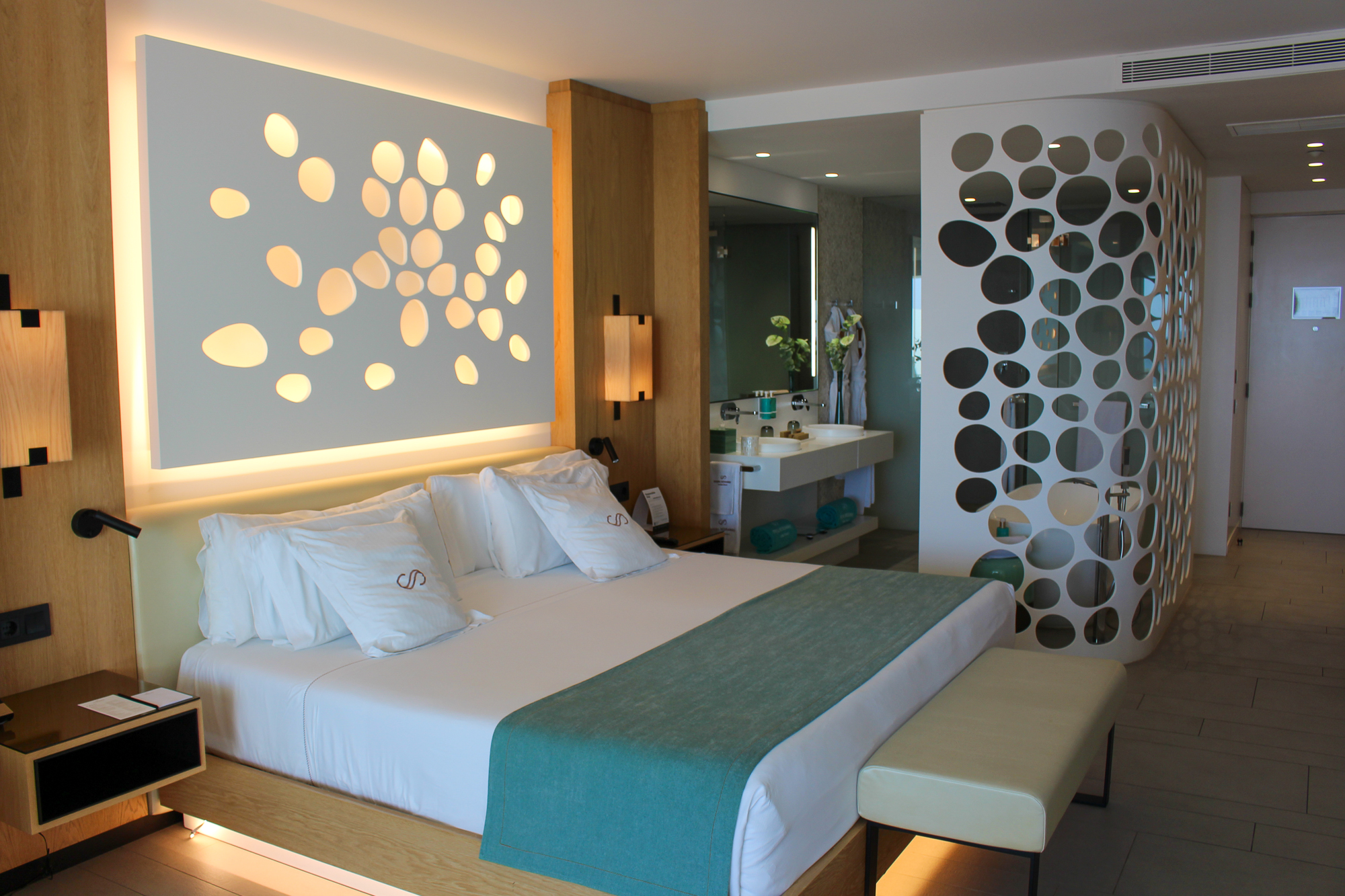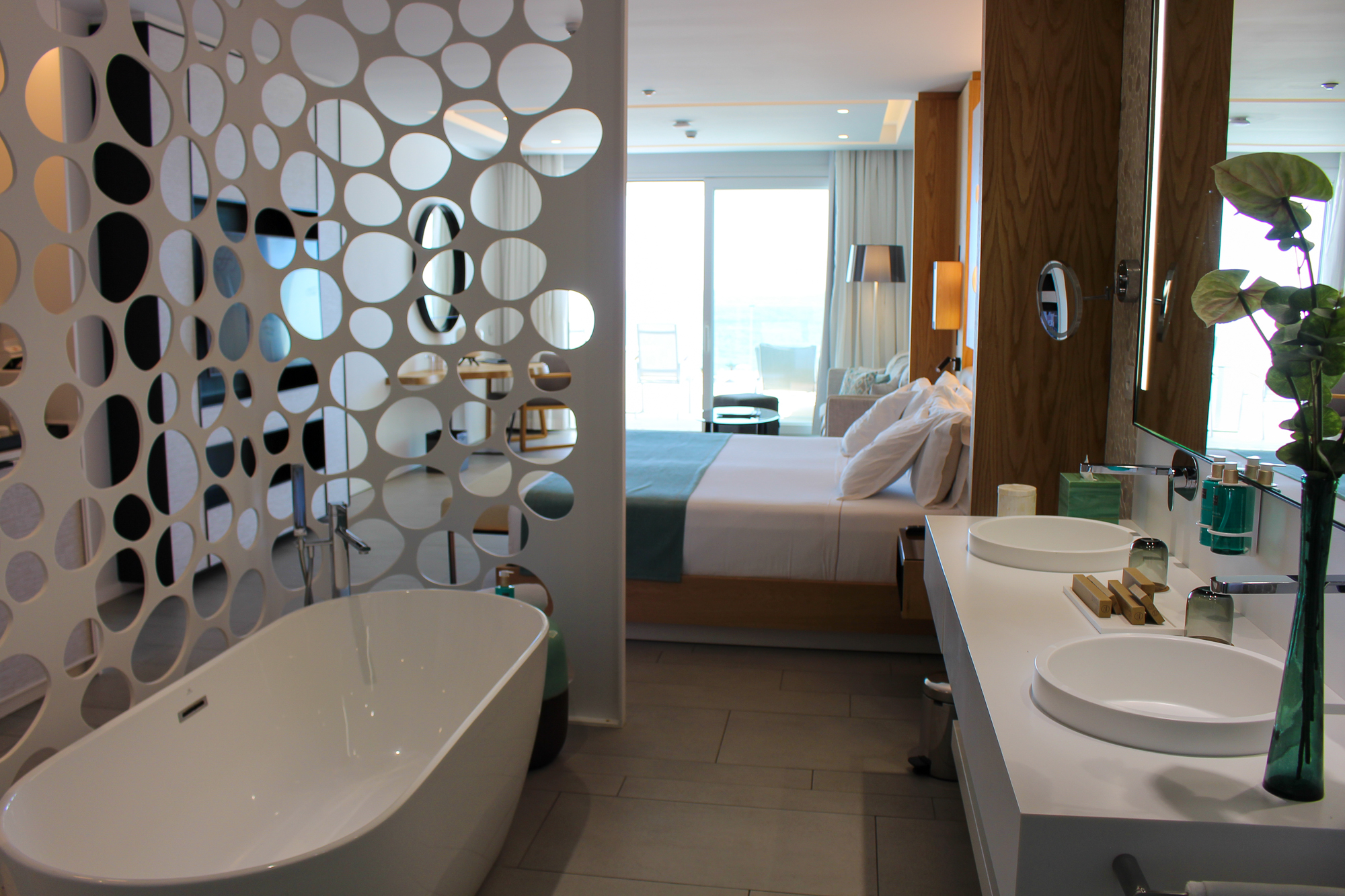 De suites beschikken over een groot verlicht KING SIZE-bed met een stijlvol ontworpen hoofdbord en een zeer moderne badkamer met dubbele wastafel en een bad van KRION. Er is een aparte regendouche en een afzonderlijk toilet. De JS is voorzien van individueel ingebouwde airconditioning.