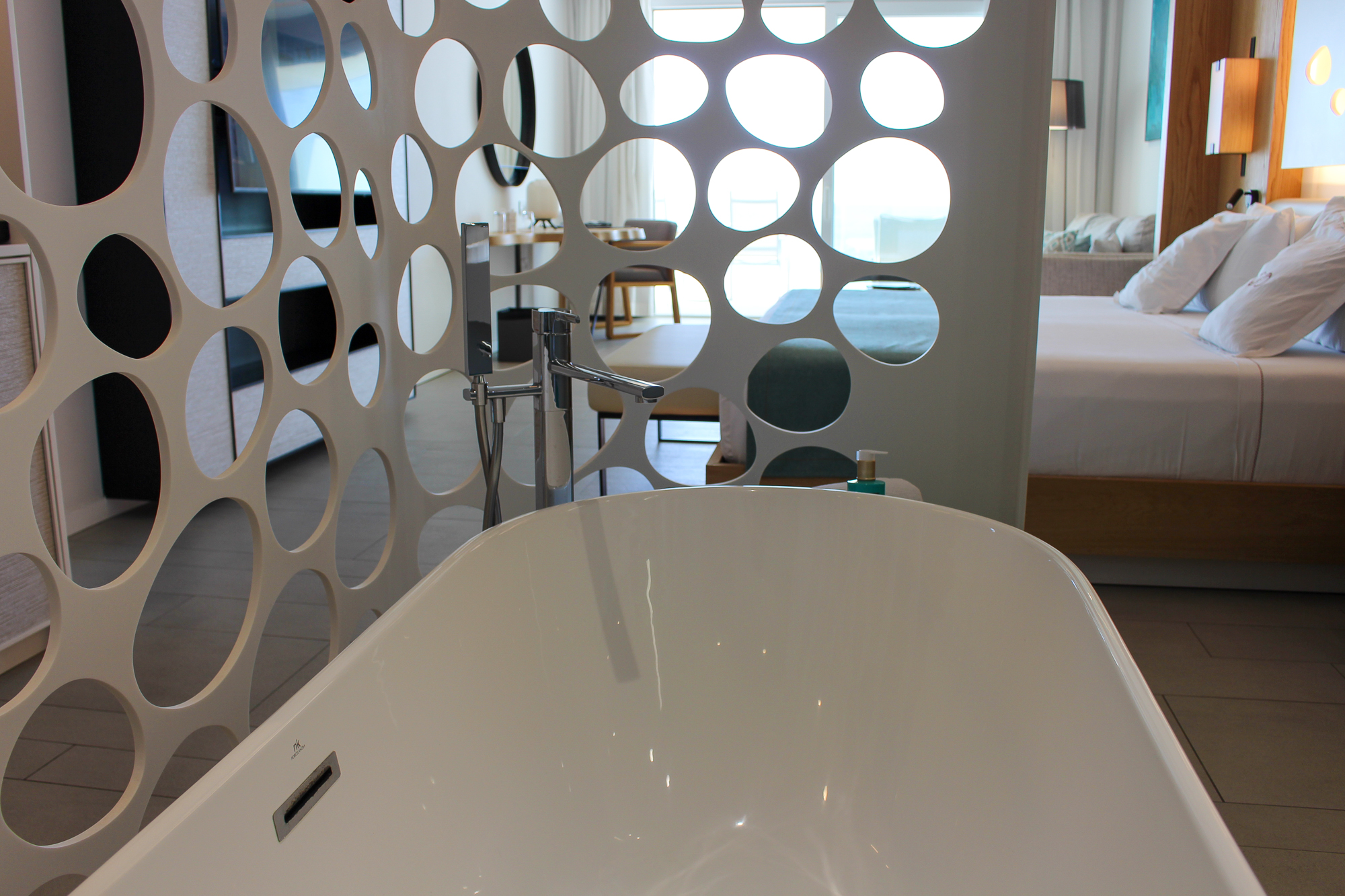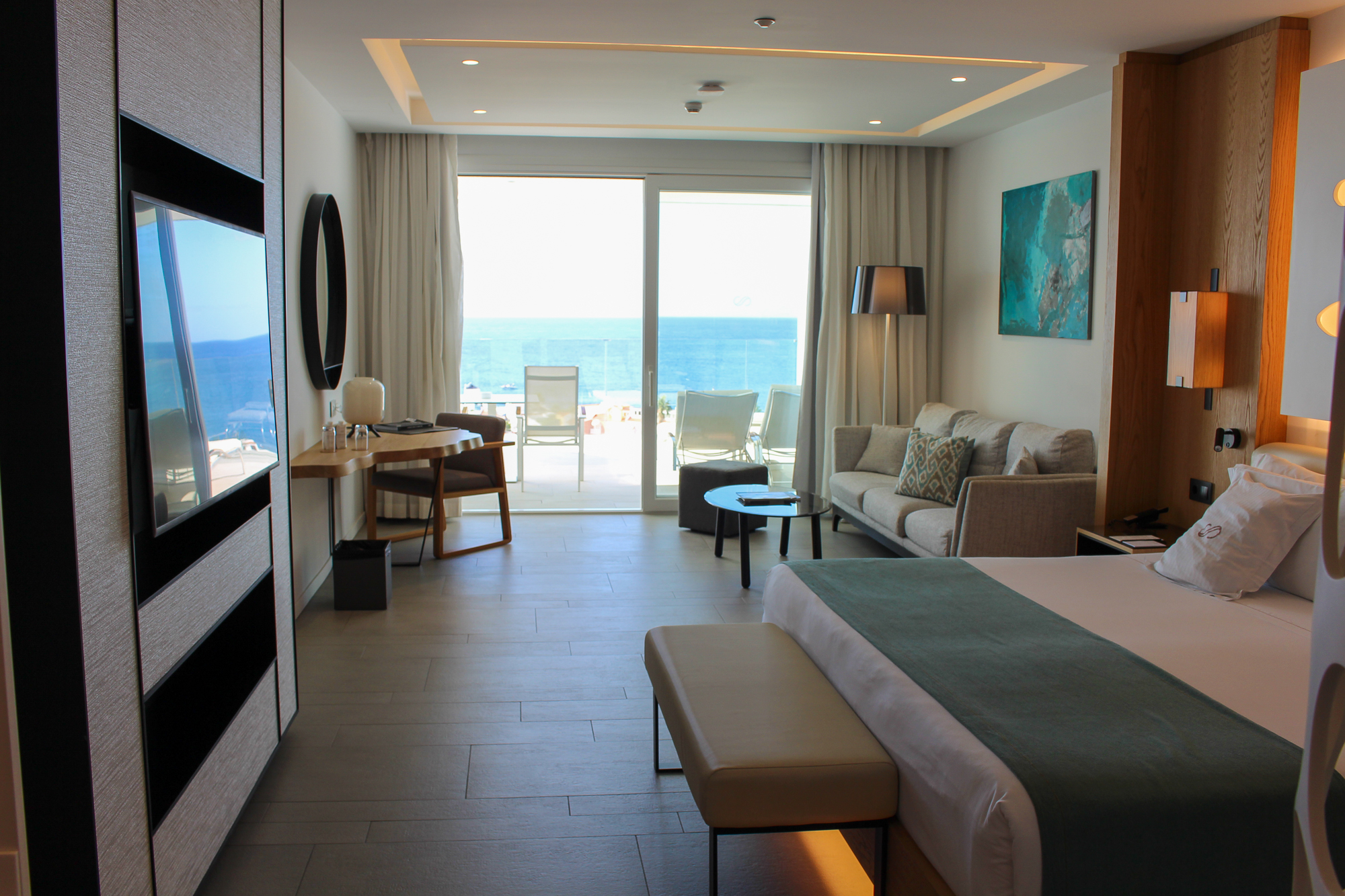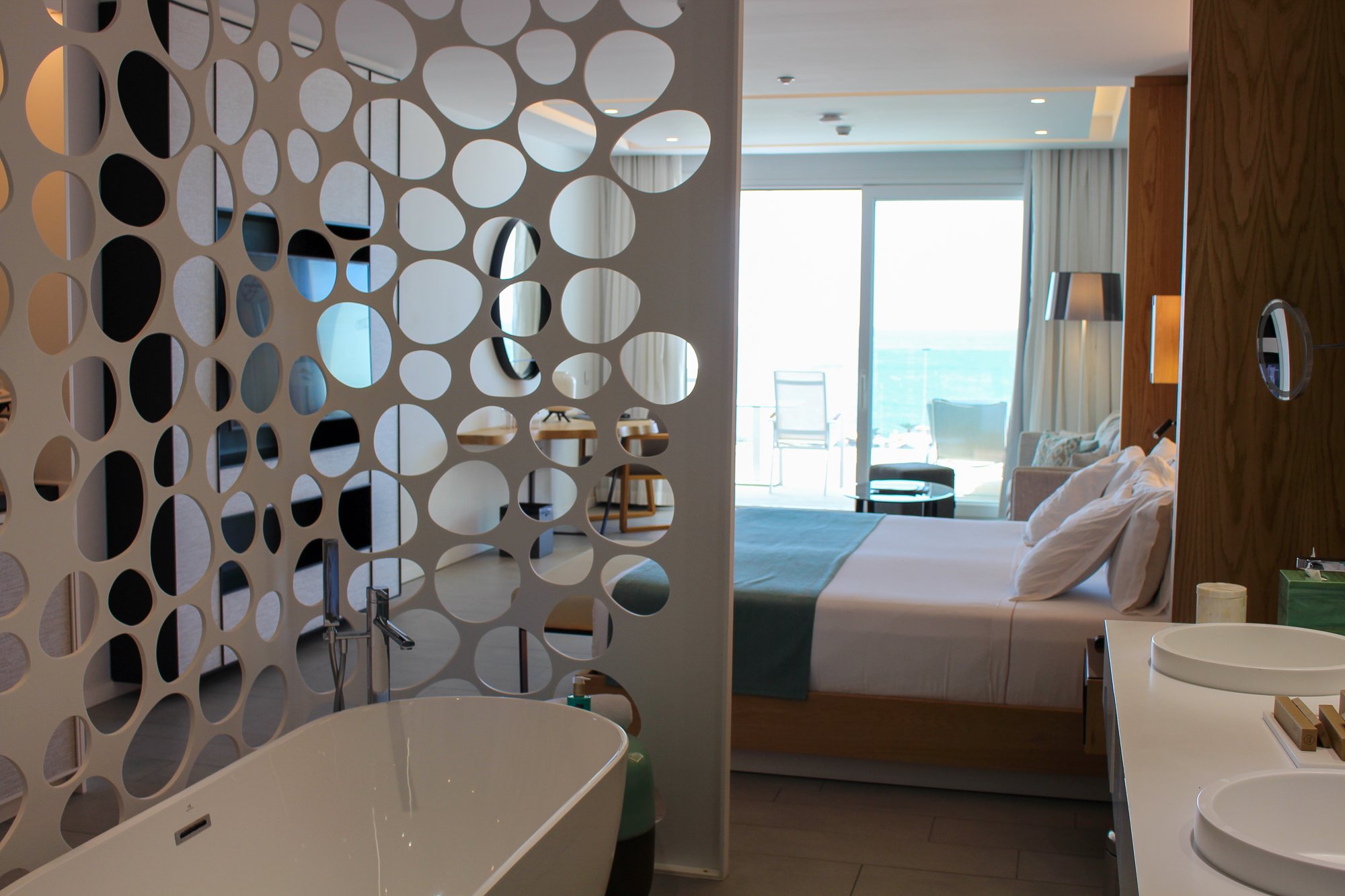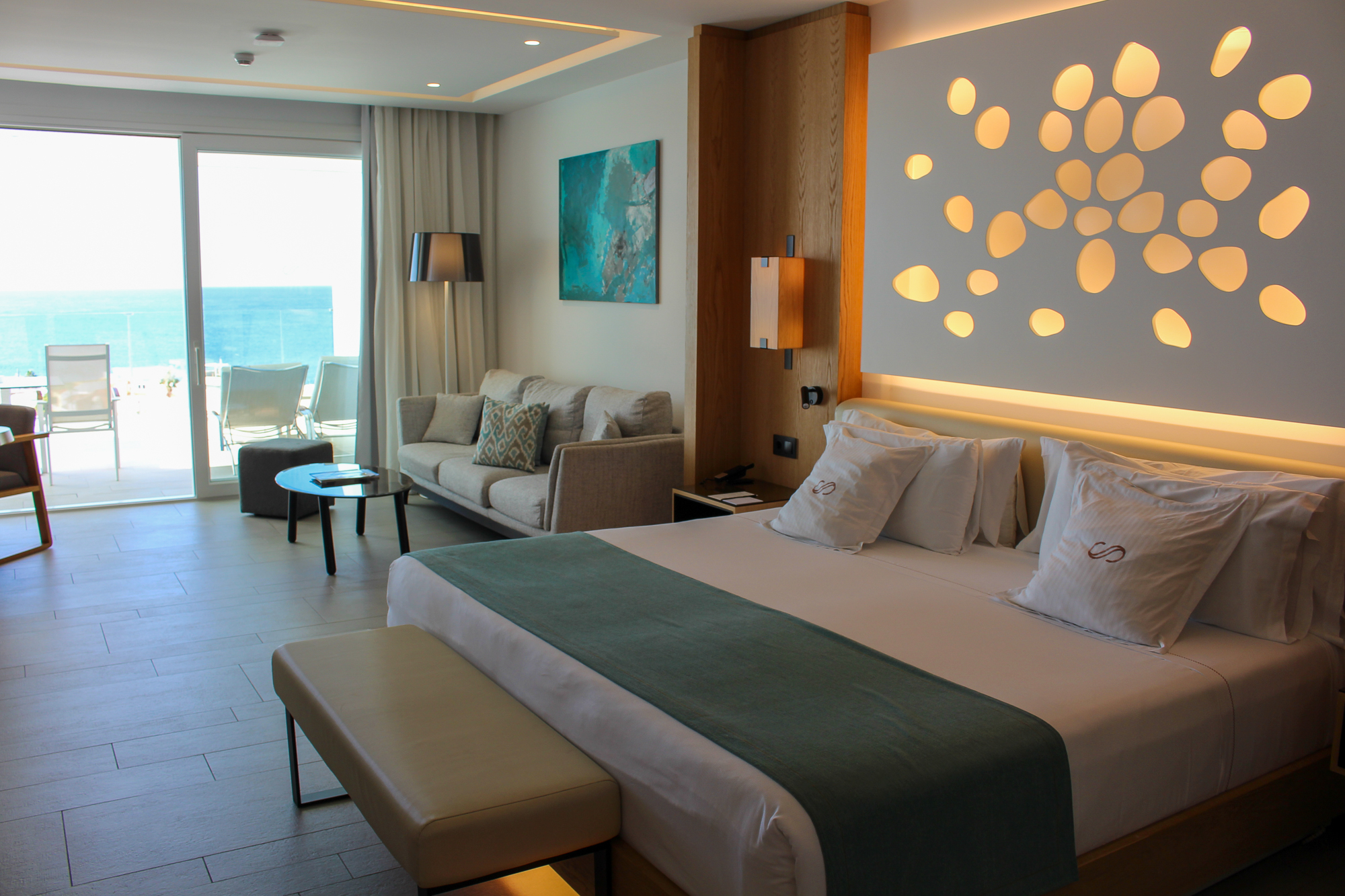 De suites beschikken over een groot verlicht KING SIZE-bed met een stijlvol ontworpen hoofdbord en een zeer moderne badkamer met dubbele wastafel en een bad van KRION. Er is een aparte regendouche en een afzonderlijk toilet. De JS is voorzien van individueel ingebouwde airconditioning.