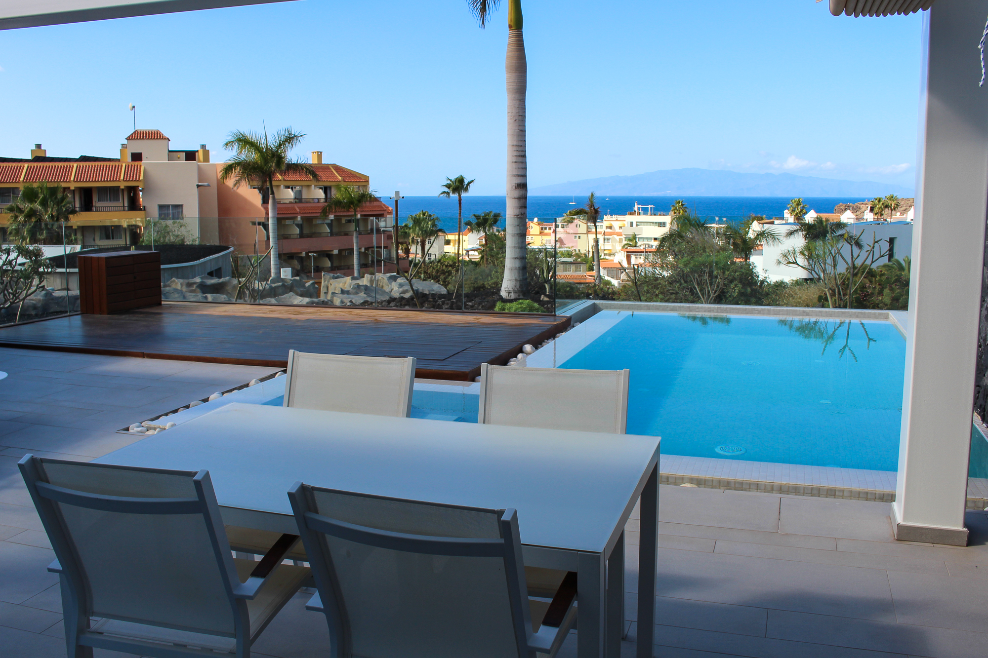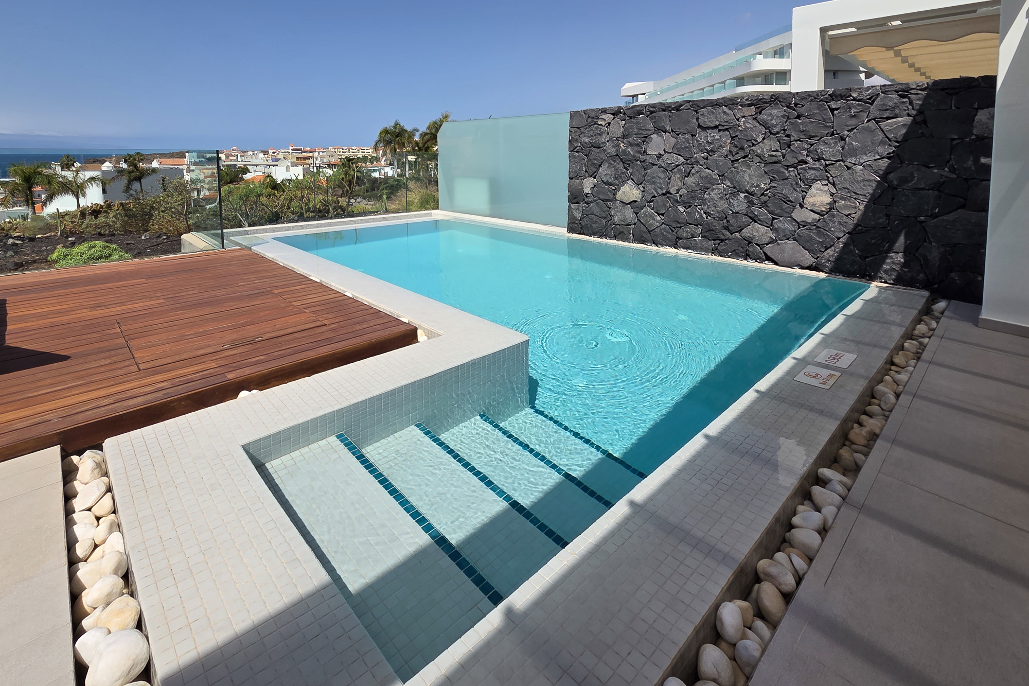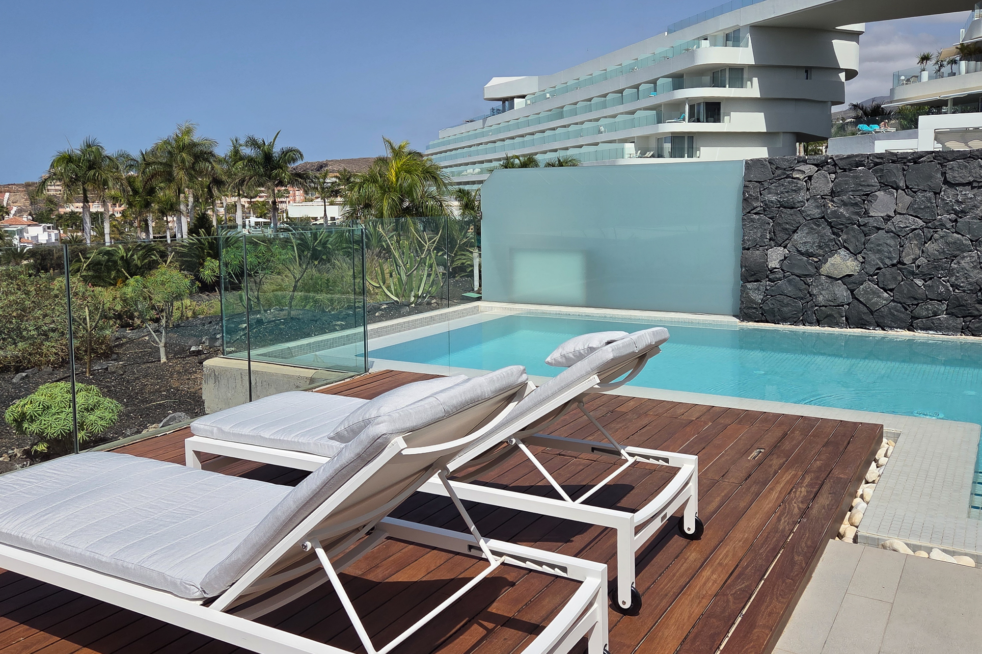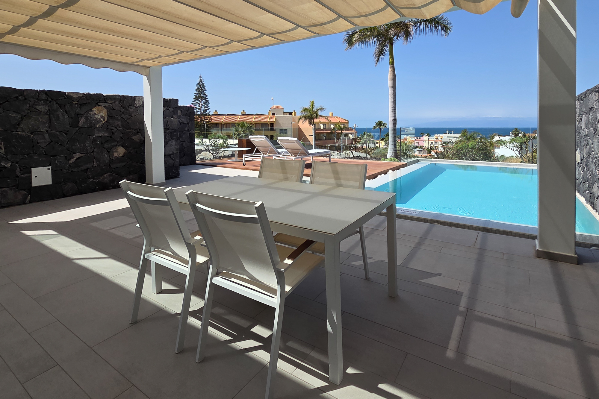 Outdoors, the terrace is designed as a true extension of the home, combining lounging and dining areas with a private pool, creating an intimate setting for relaxation and year-round enjoyment of Tenerife’s climate.