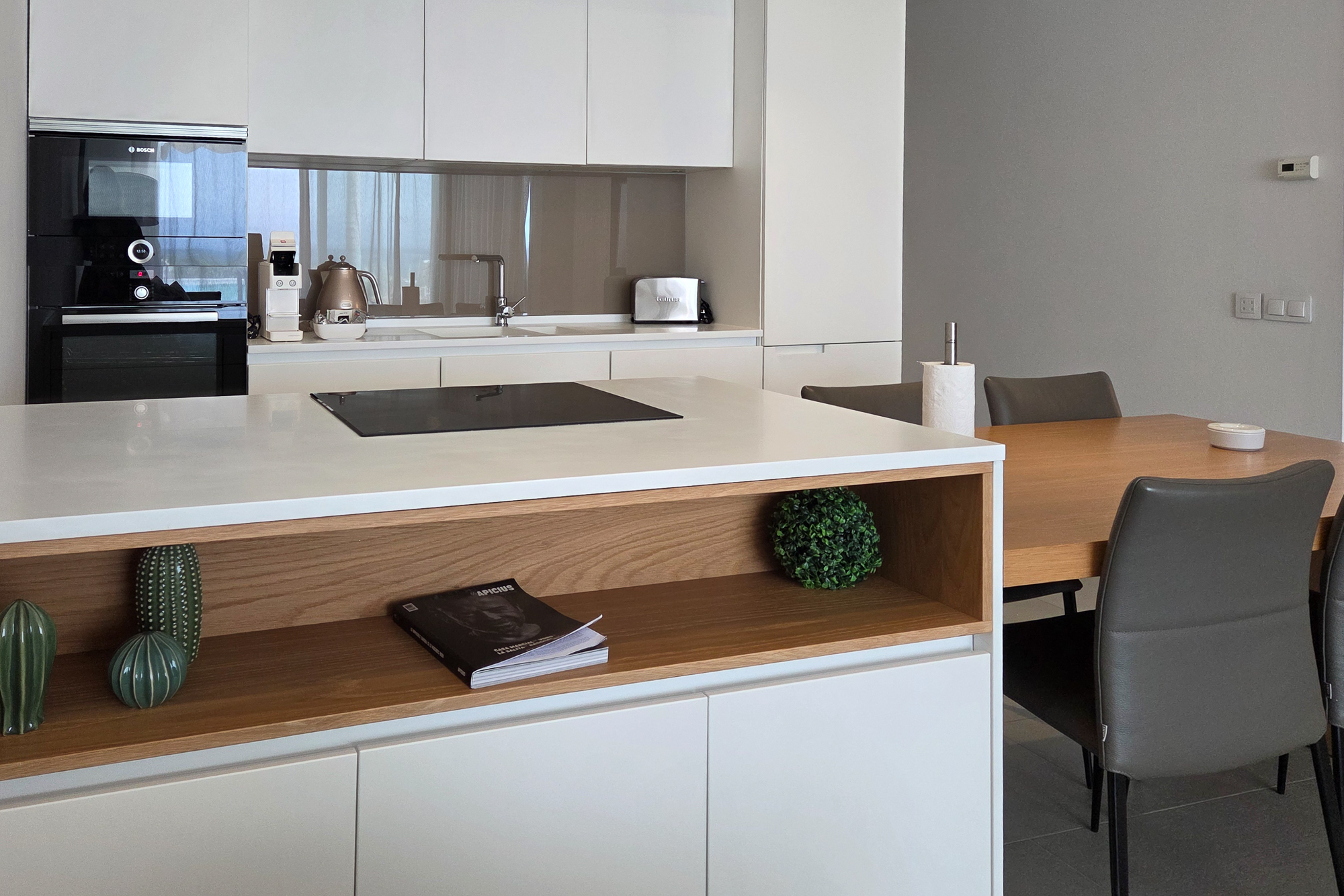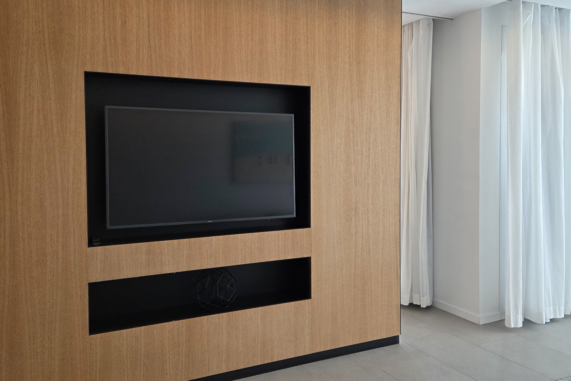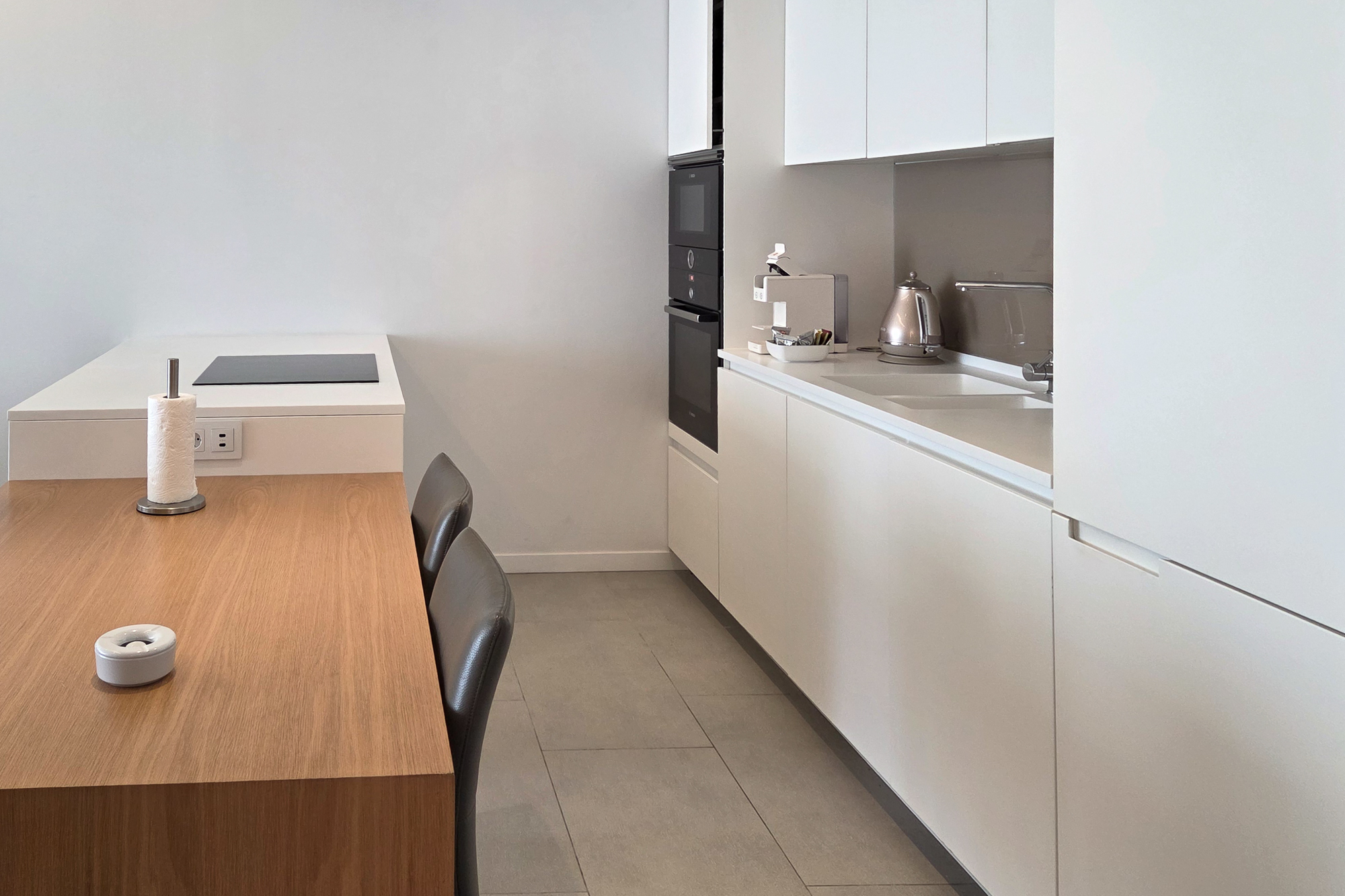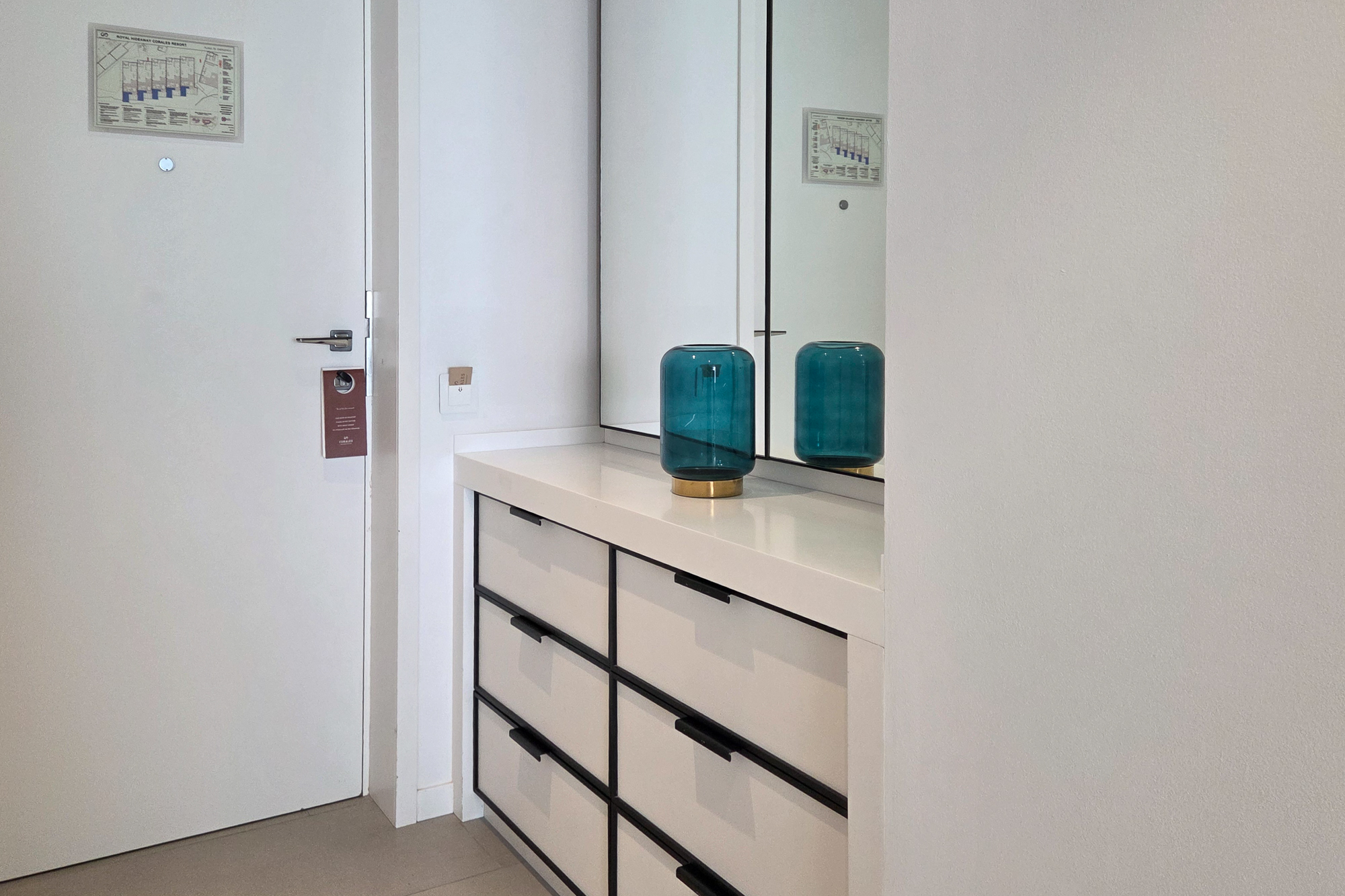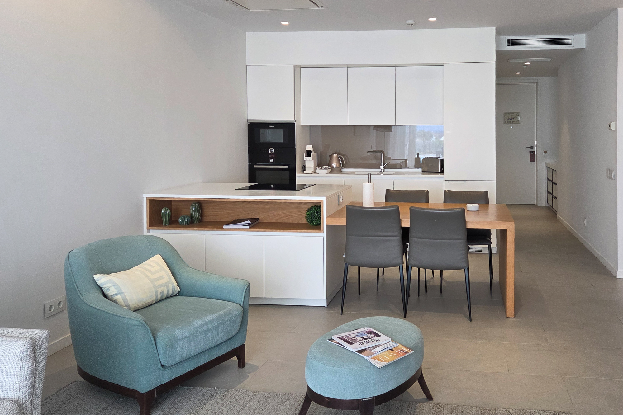 The apartment is organised along a clear and functional axis, separating the private and living areas while maximising light and outdoor connection. Upon entering, a discreet hallway leads to the open-plan living and dining area, where large sliding doors open directly onto the expansive terrace and private swimming pool, extending the living space outdoors.