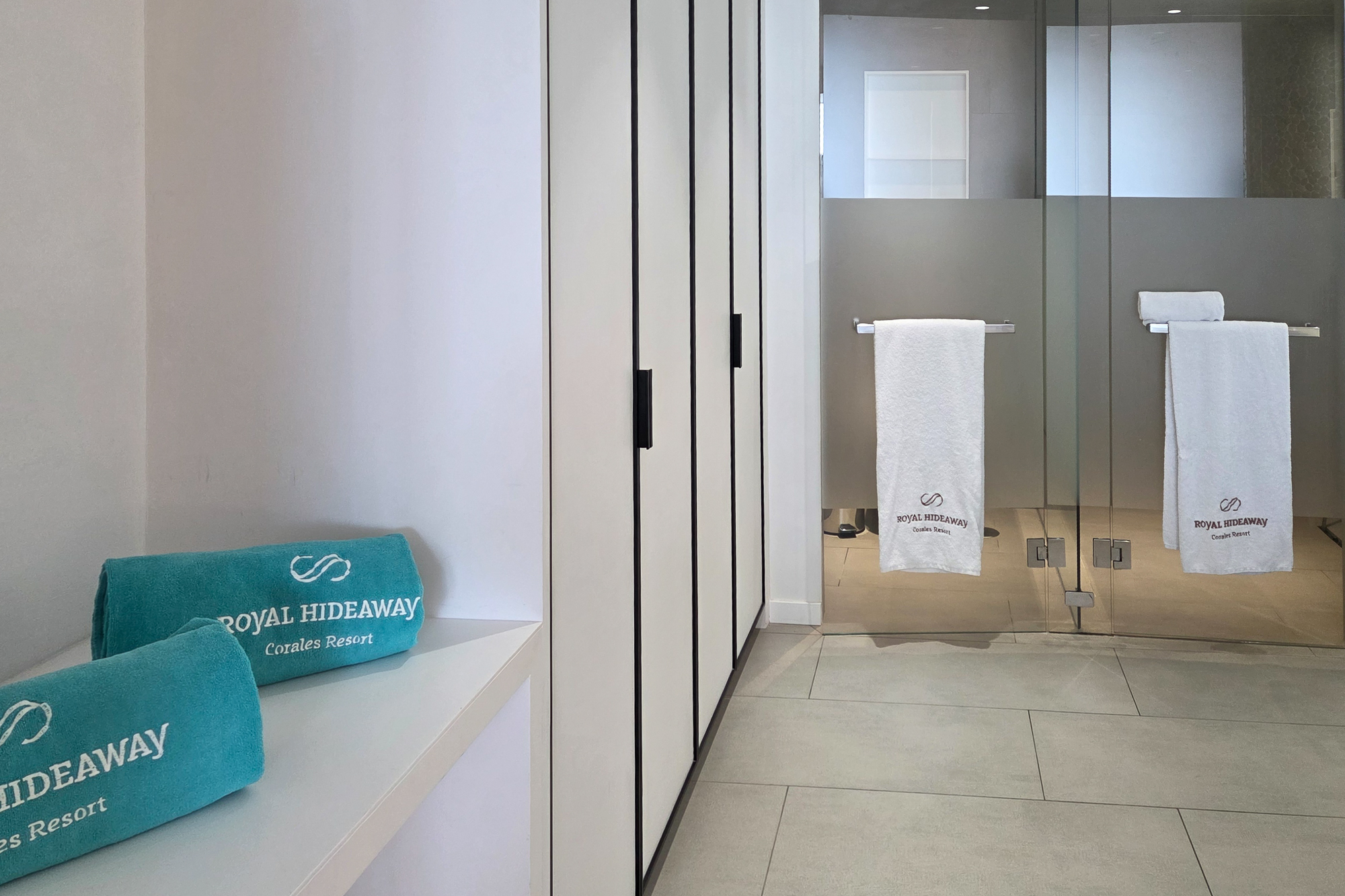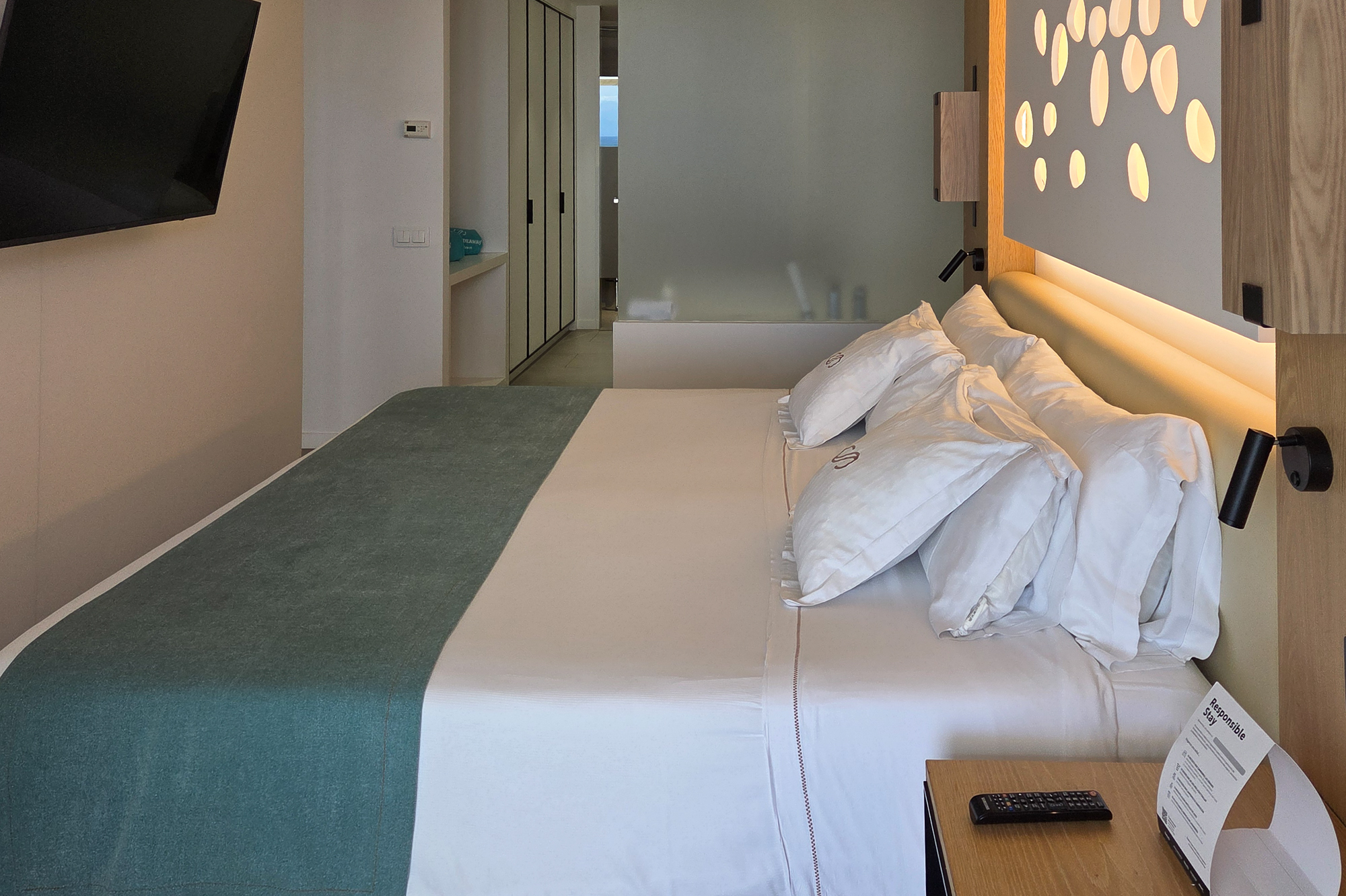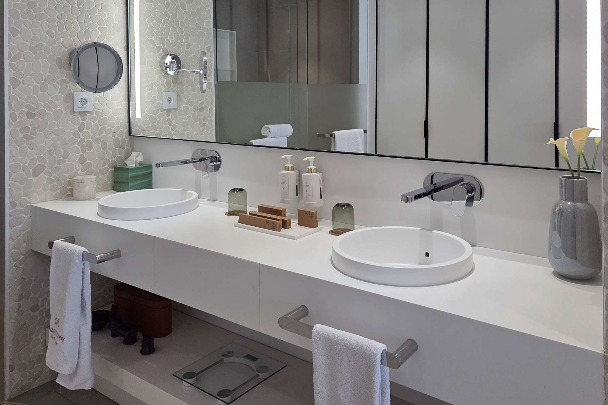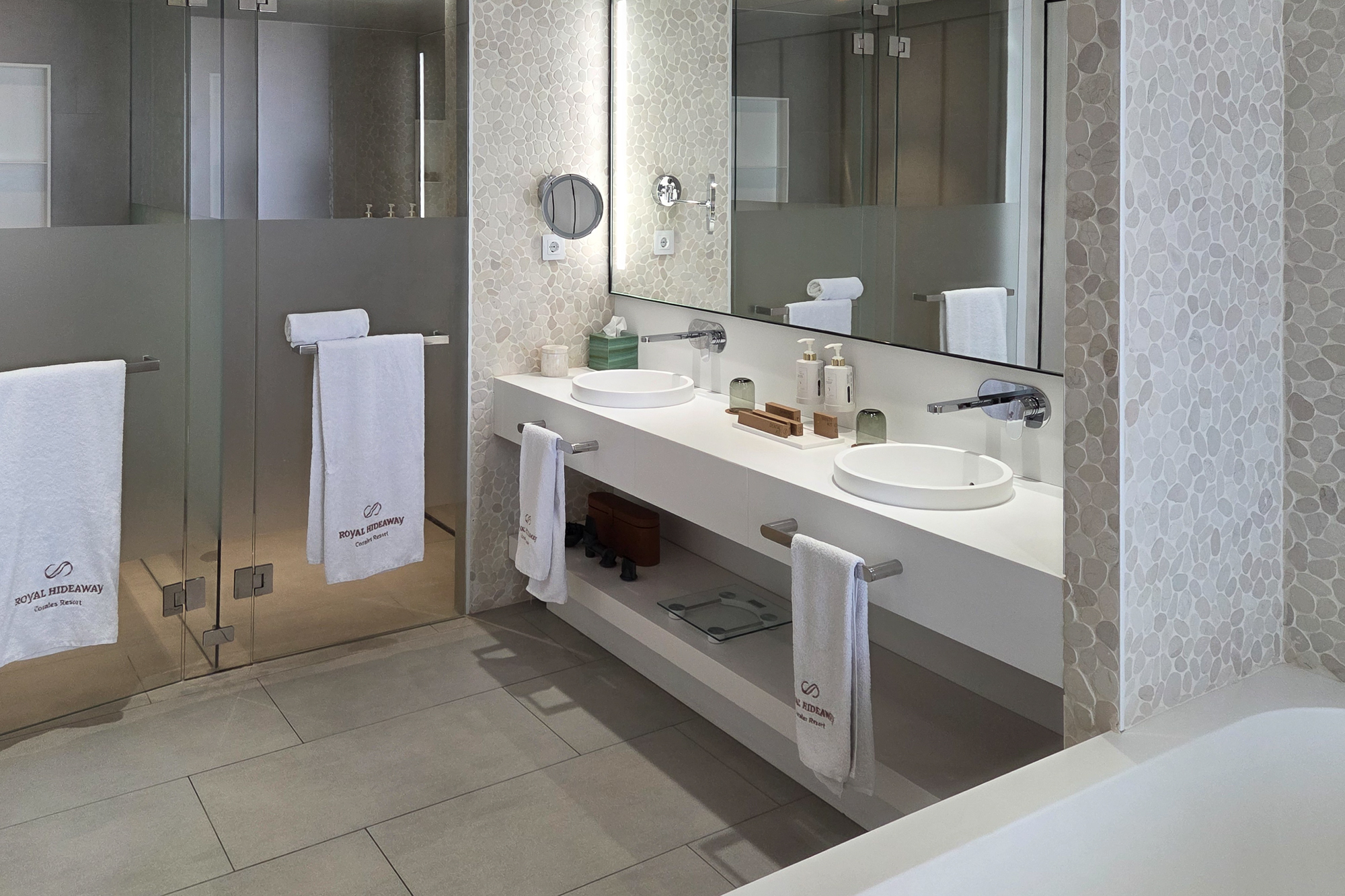 The bedroom is positioned for privacy and comfort, featuring built-in wardrobes and direct access to the bathroom. The bathroom is spacious and well-appointed, with a refined layout that includes double sinks and a walk-in shower, reflecting the contemporary design language of Corales Suites.