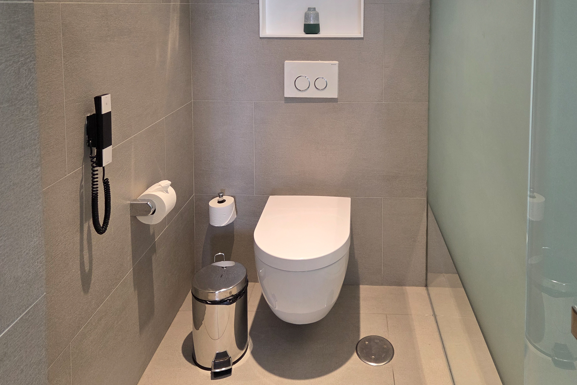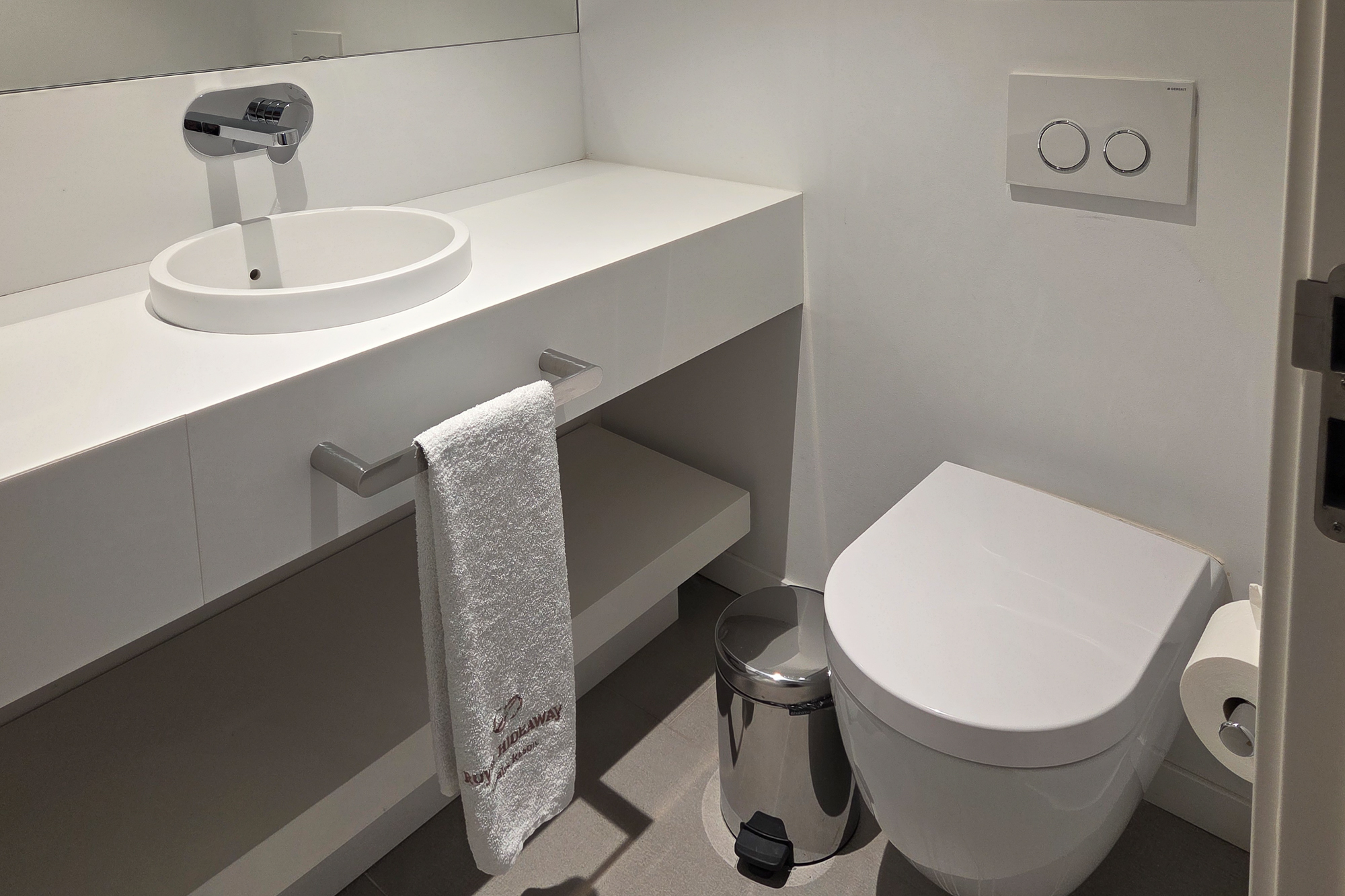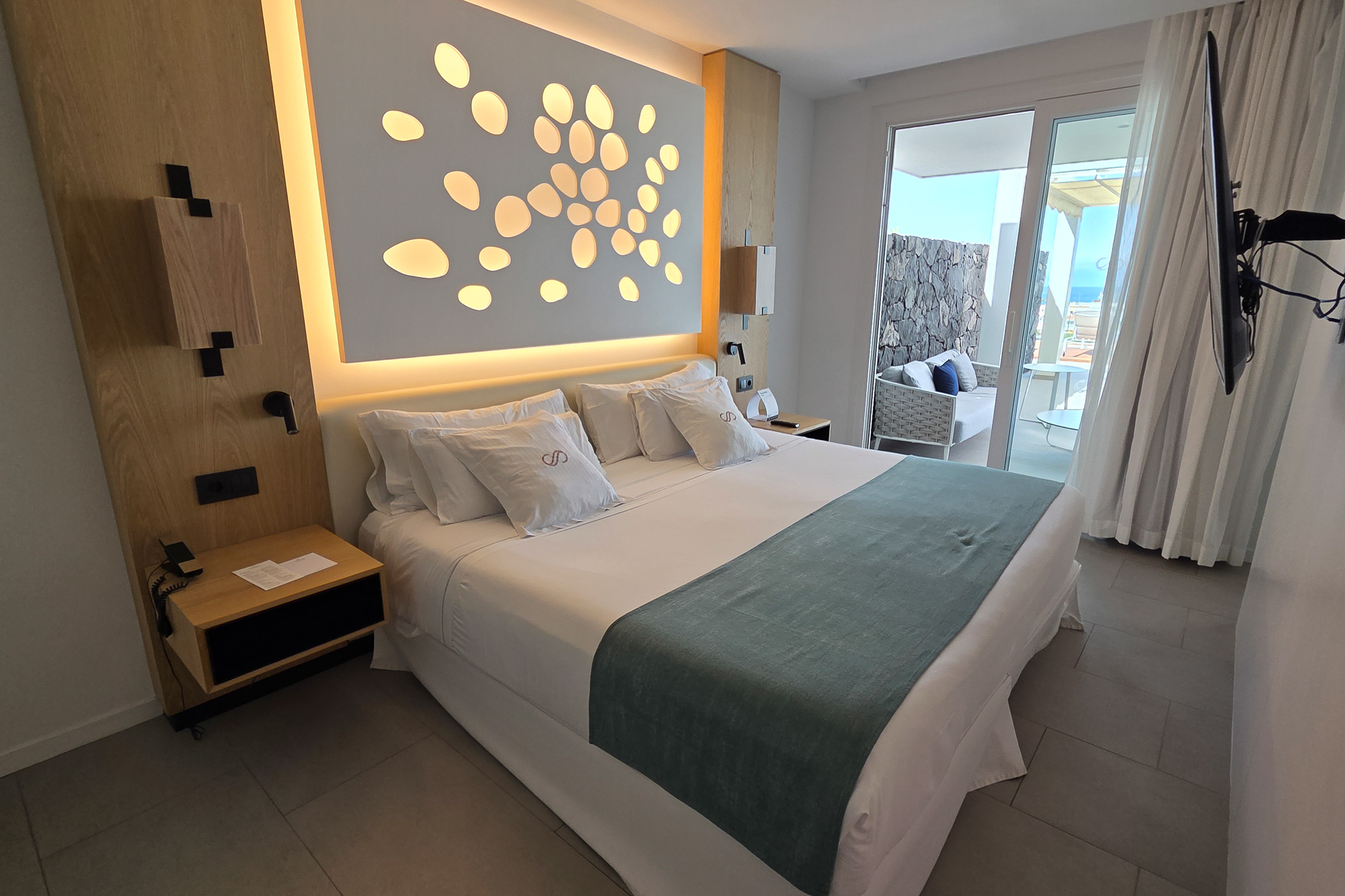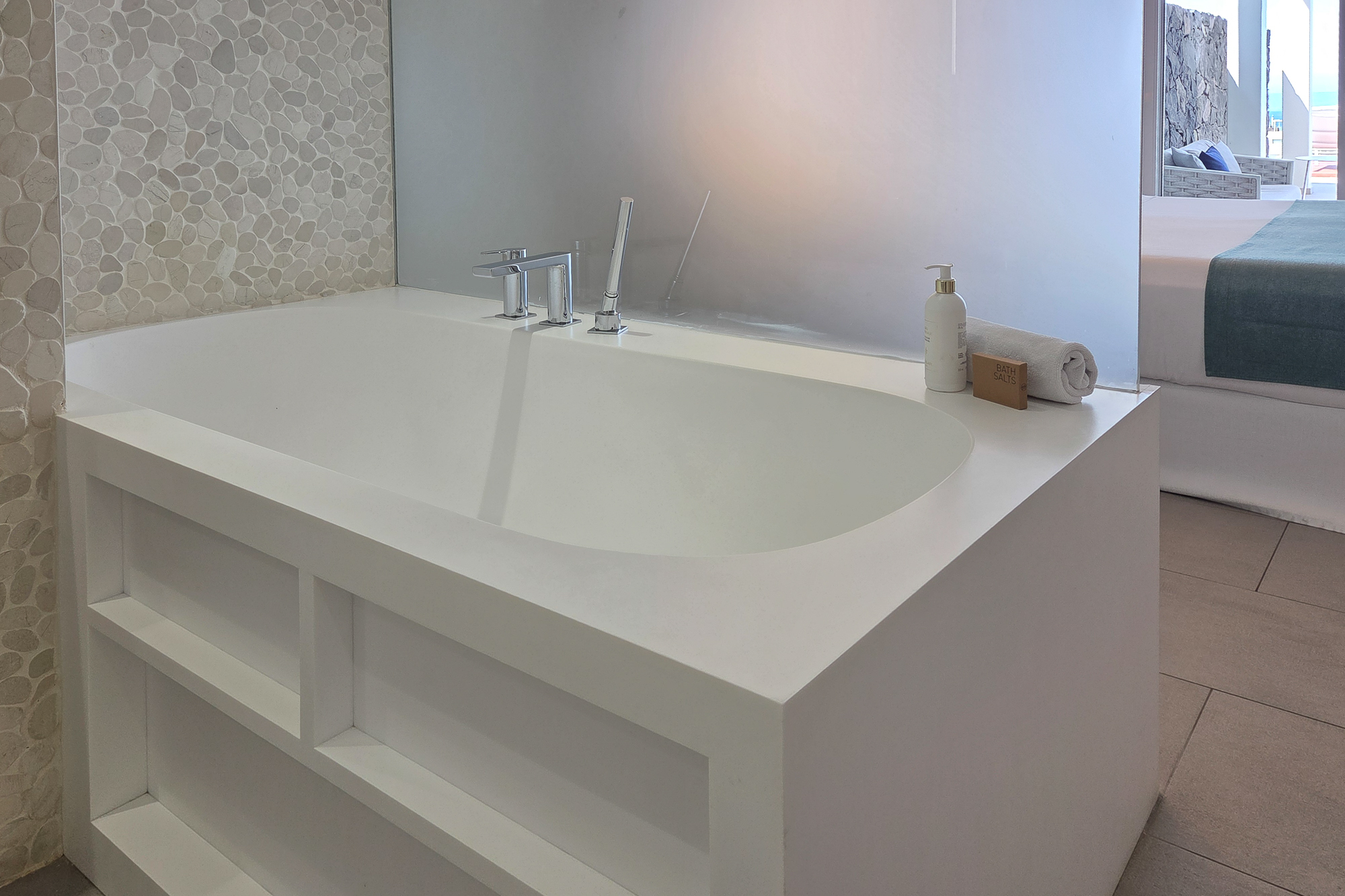 The bedroom is positioned for privacy and comfort, featuring built-in wardrobes and direct access to the bathroom. The bathroom is spacious and well-appointed, with a refined layout that includes double sinks and a walk-in shower, reflecting the contemporary design language of Corales Suites.