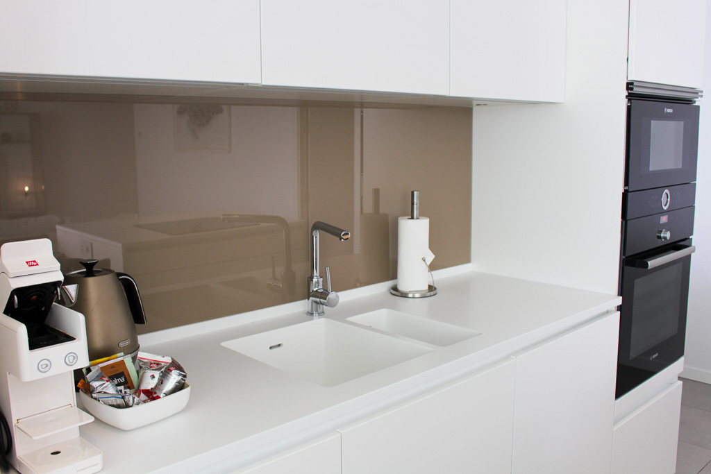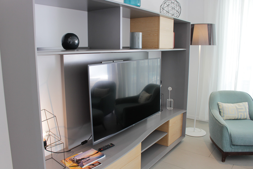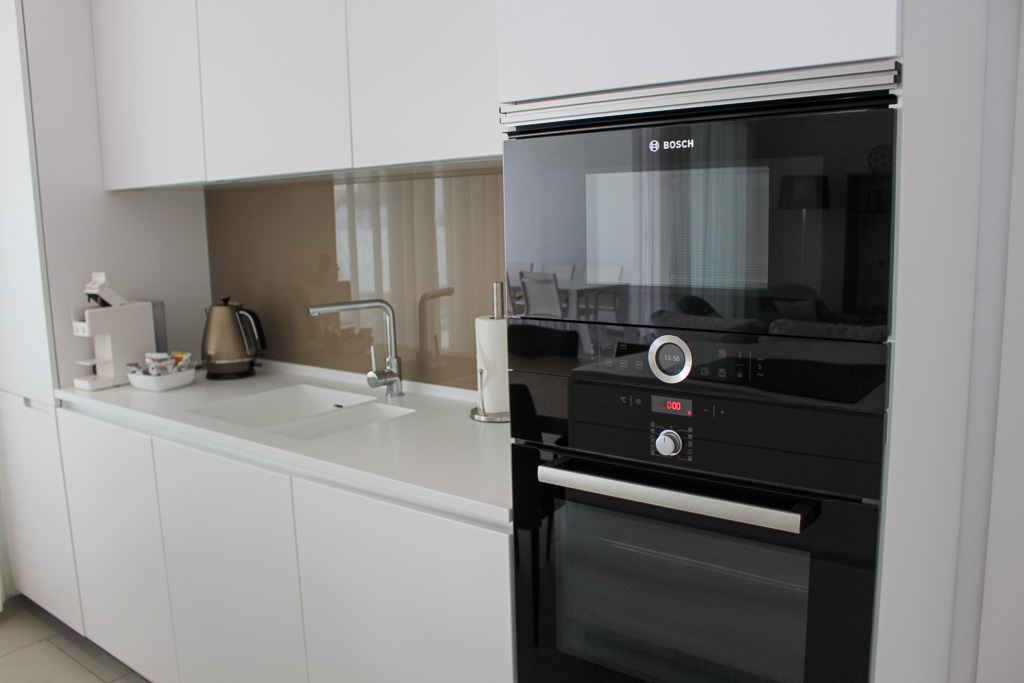 The property features a modern open-plan kitchen with a stylish cooking island, fully equipped with high-end appliances. The master bedroom includes a king-size bed, an exquisite KRION bathtub, a spacious walk-in shower, a separate toilet, and a large desk with a 49” TV, creating a perfect blend of relaxation and functionality.