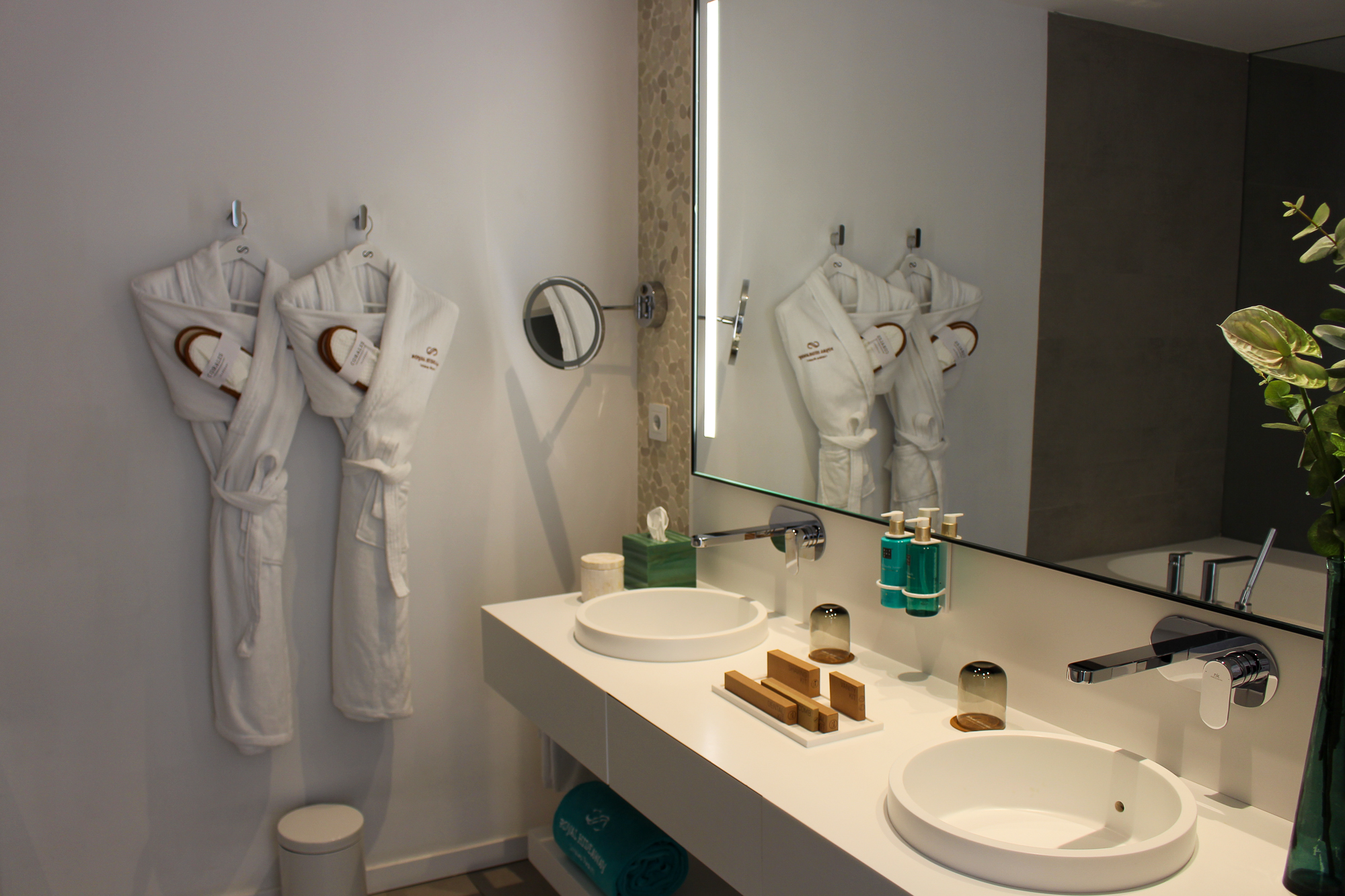 The suite features a large illuminated KING SIZE bed with a beautifully designed headboard and a contemporary bathroom fitted with double sinks and a KRION bathtub. A separate rain shower and an independent toilet complete the elegant bathroom layout. For optimal comfort, the Junior Suite is equipped with individual built-in air conditioning.