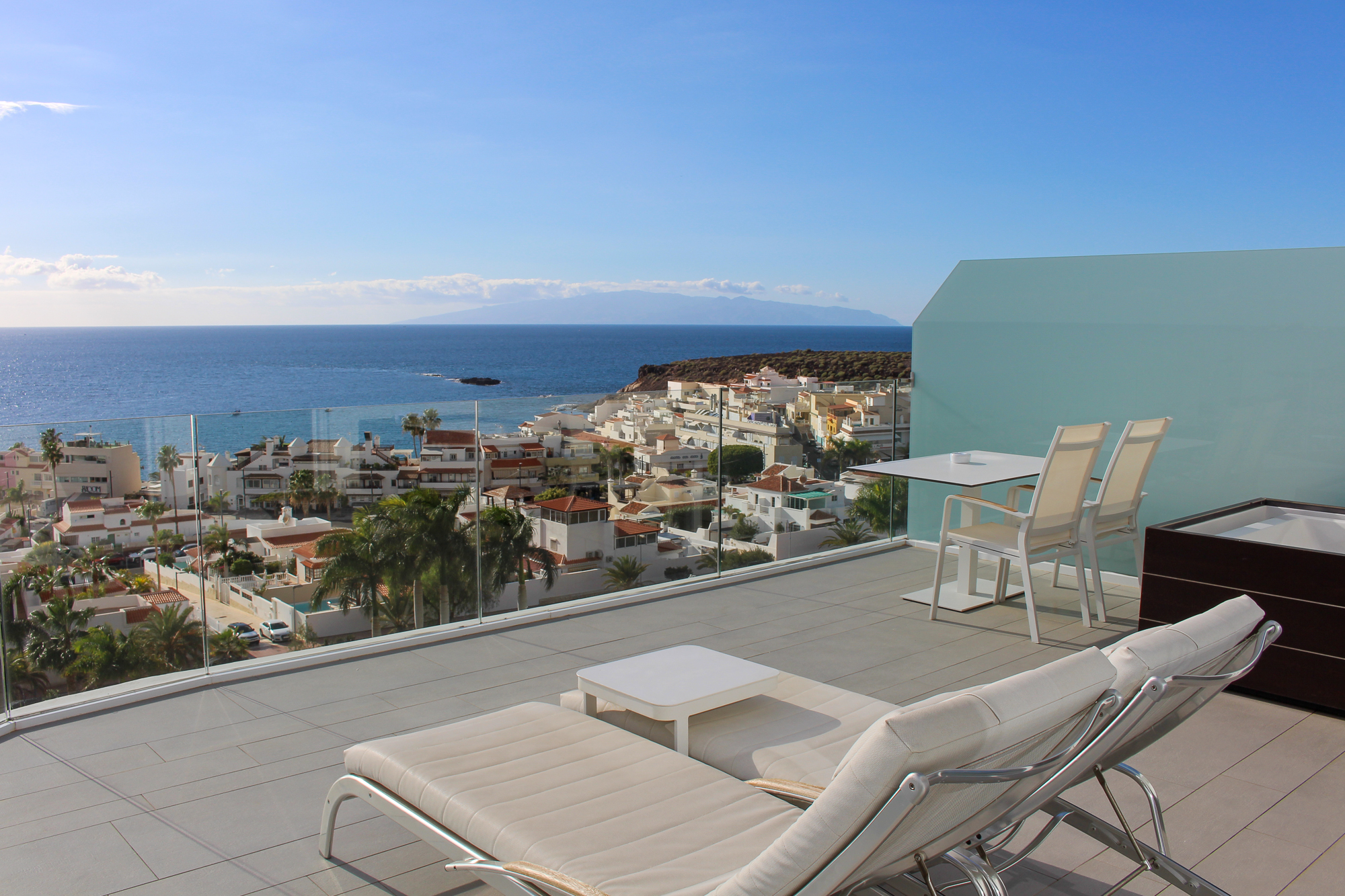 Outside, a spacious sunny terrace invites relaxation at any time of day. From here, you can enjoy breathtaking frontal views towards La Caleta and the expansive Atlantic Ocean. The private hot tub on the terrace adds an extra level of comfort, creating the perfect setting to unwind while taking in the stunning scenery.