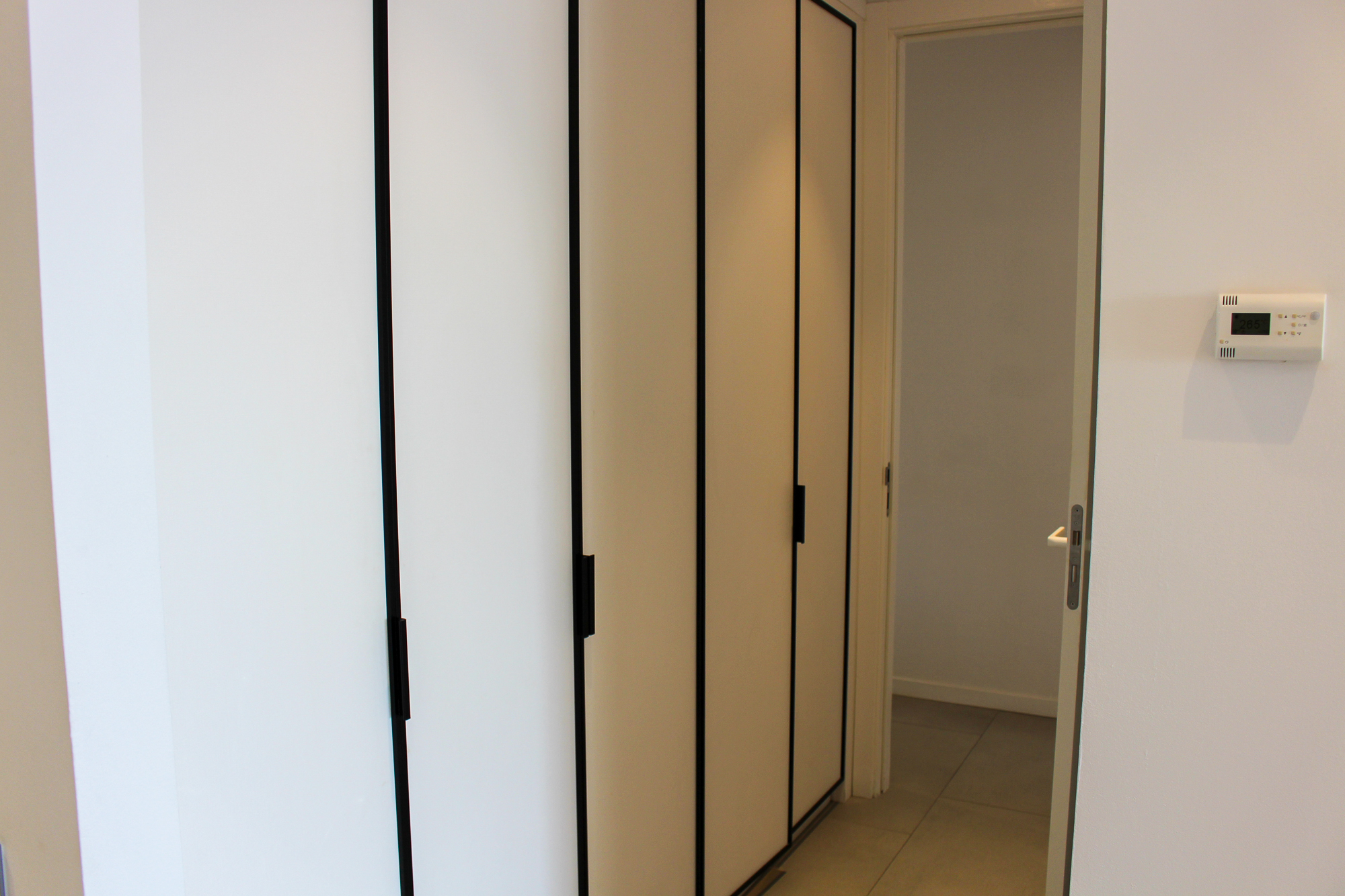 The second bedroom has a double bed with large wardrobes, the shower, toilet and sink are in a separate space in the same hallway.