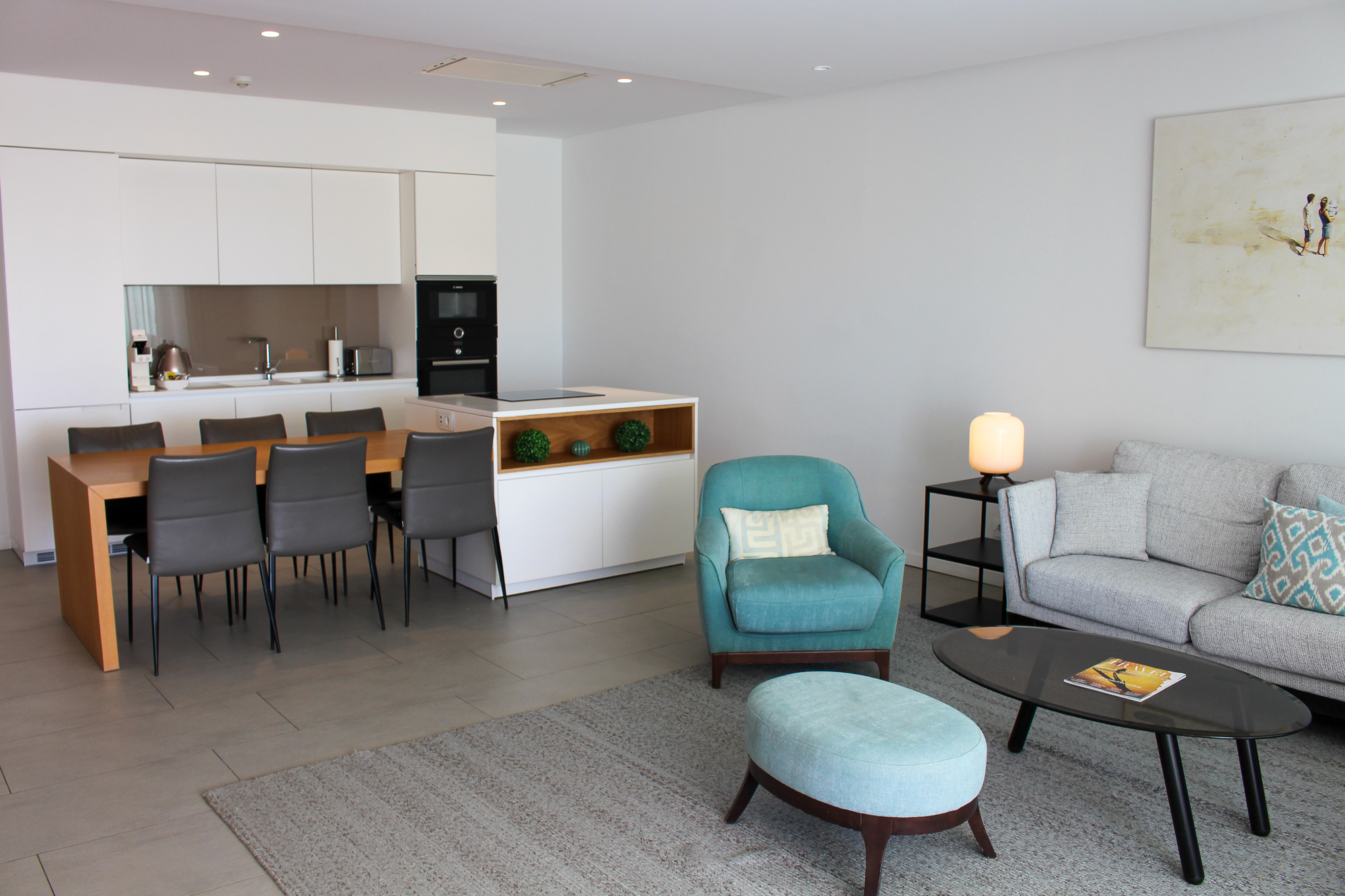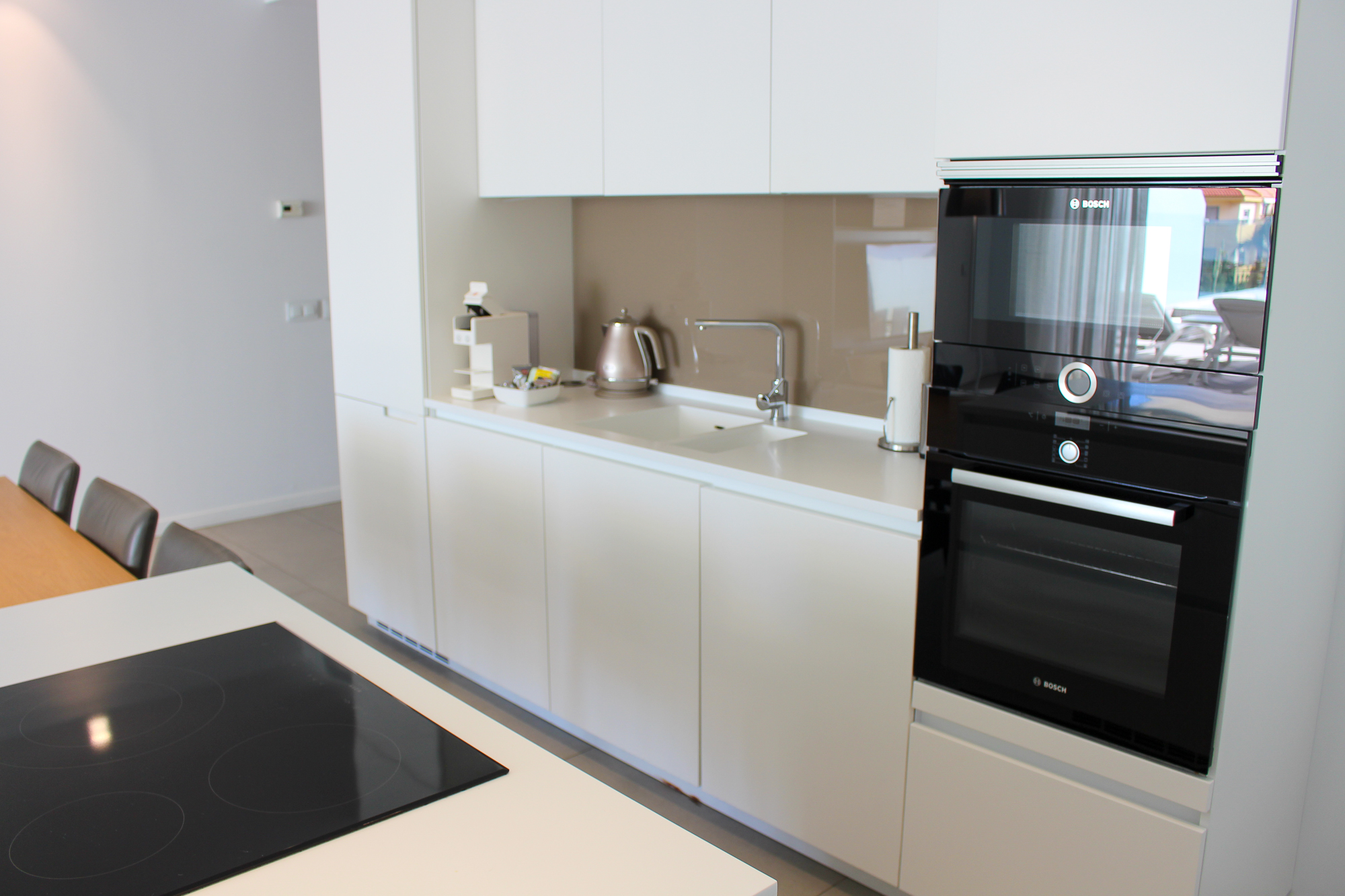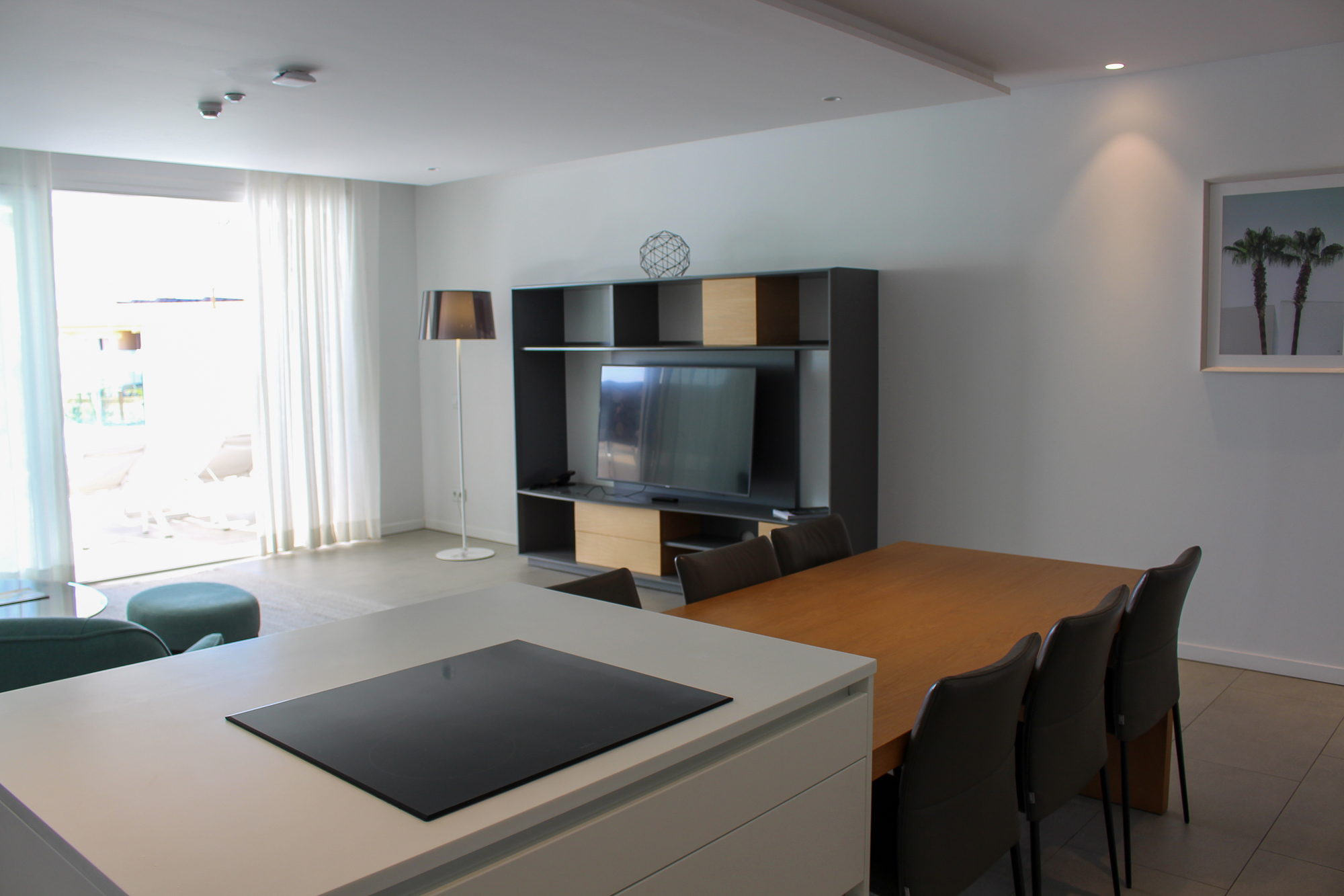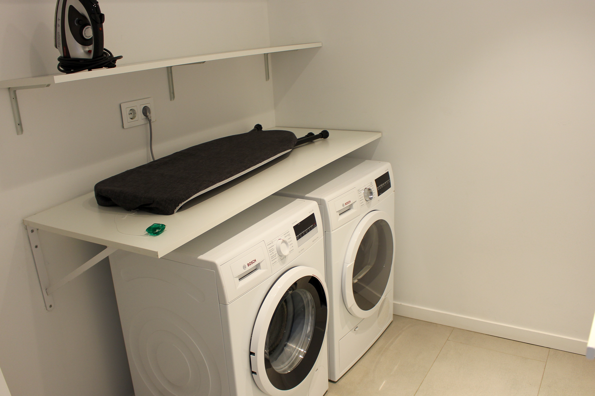 Apart from a spacious and bright living room, the property has a modern fully equipped kitchen with a cooking island and flanked by a table with 4 chairs. A separate guest toilet and a washing room are also on the same level.