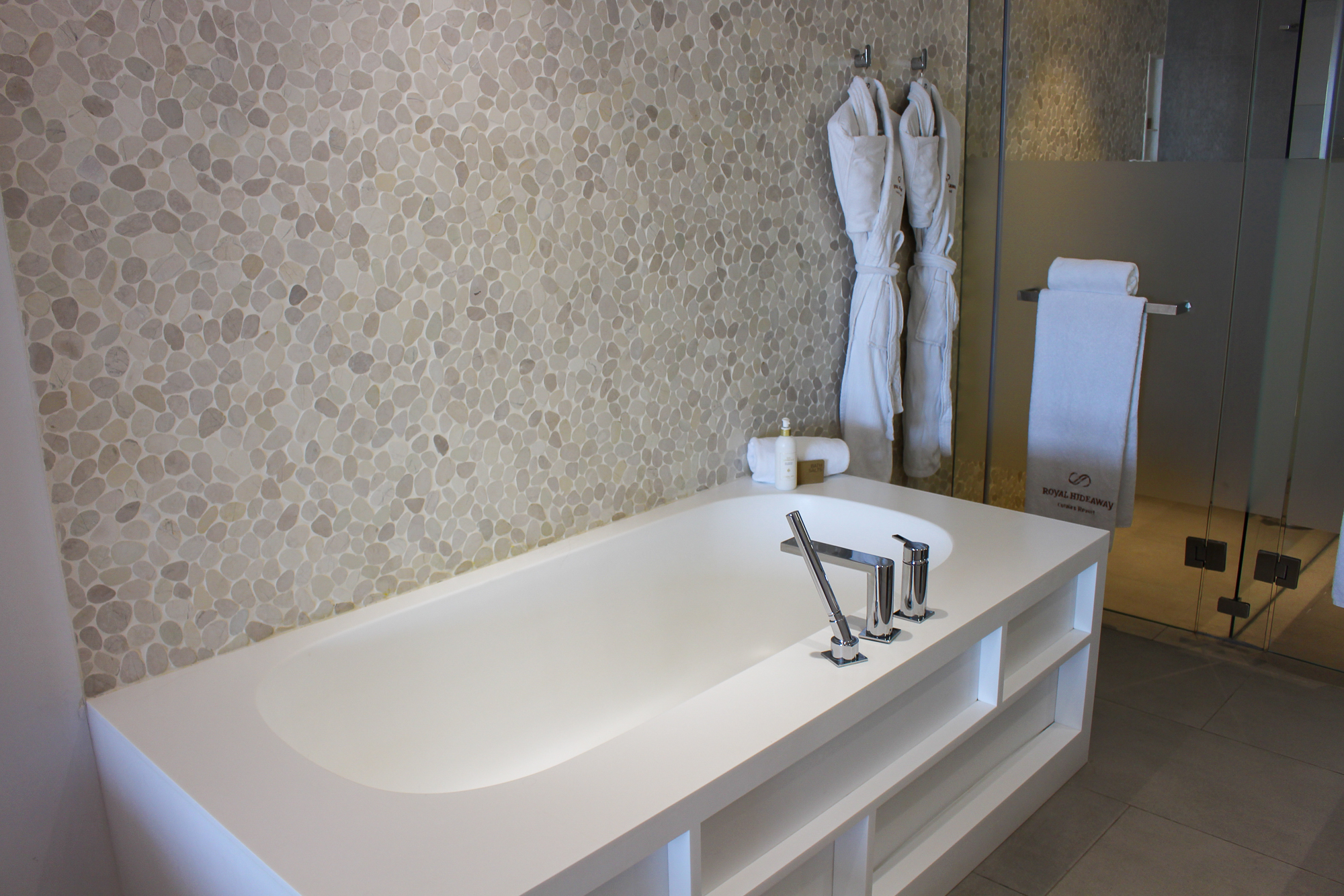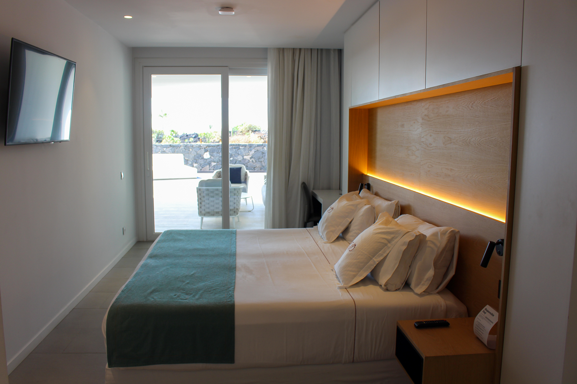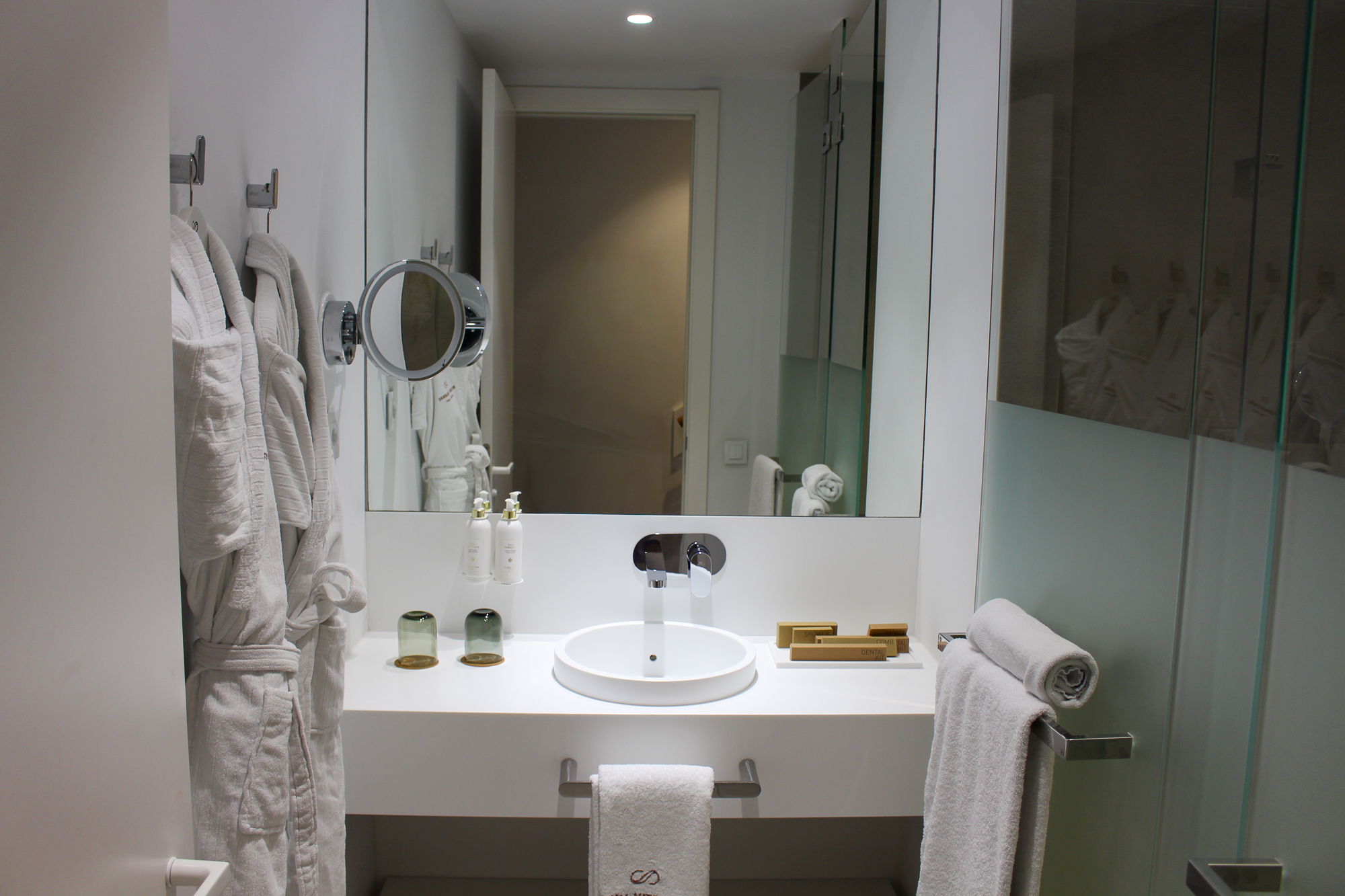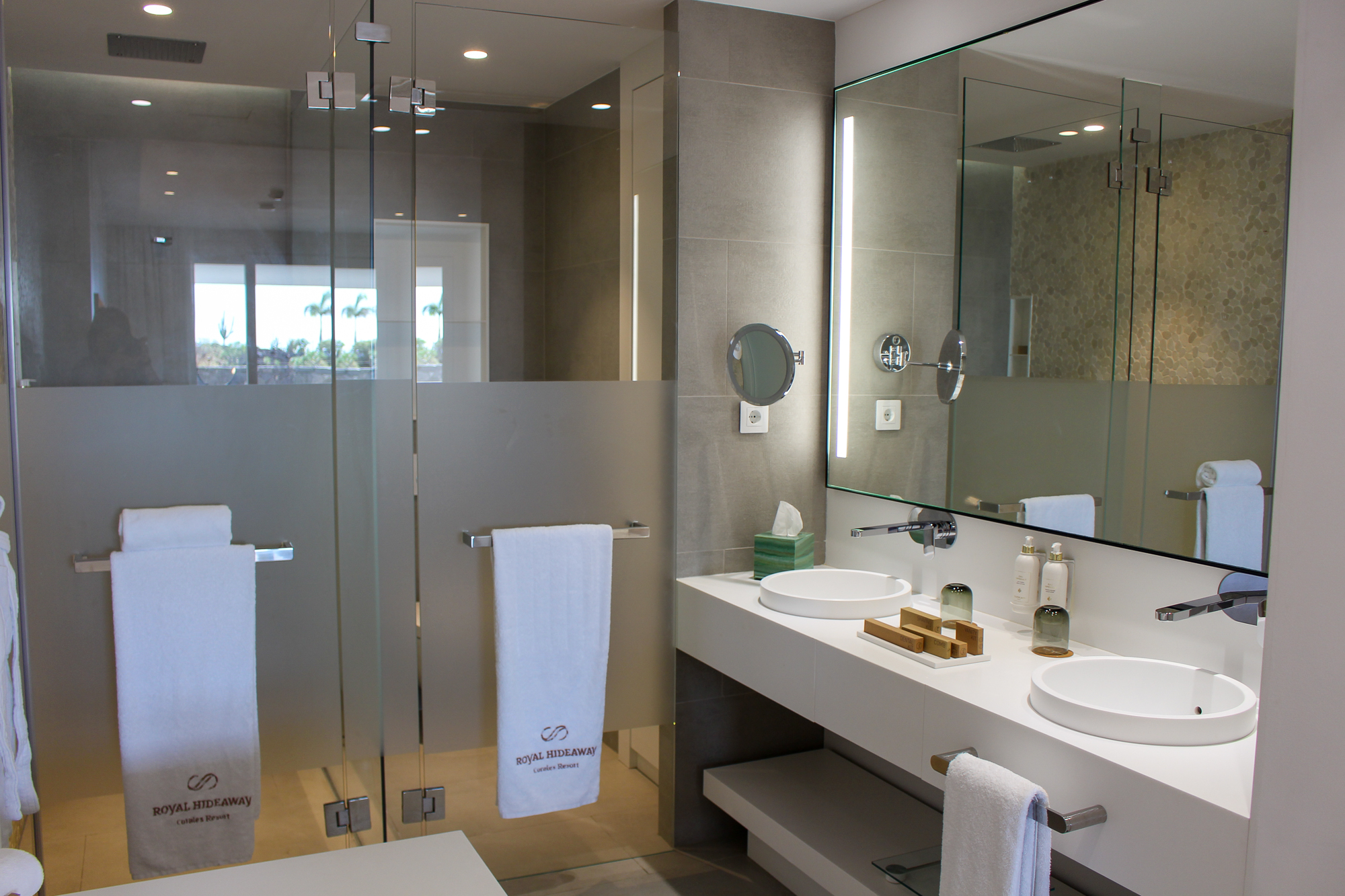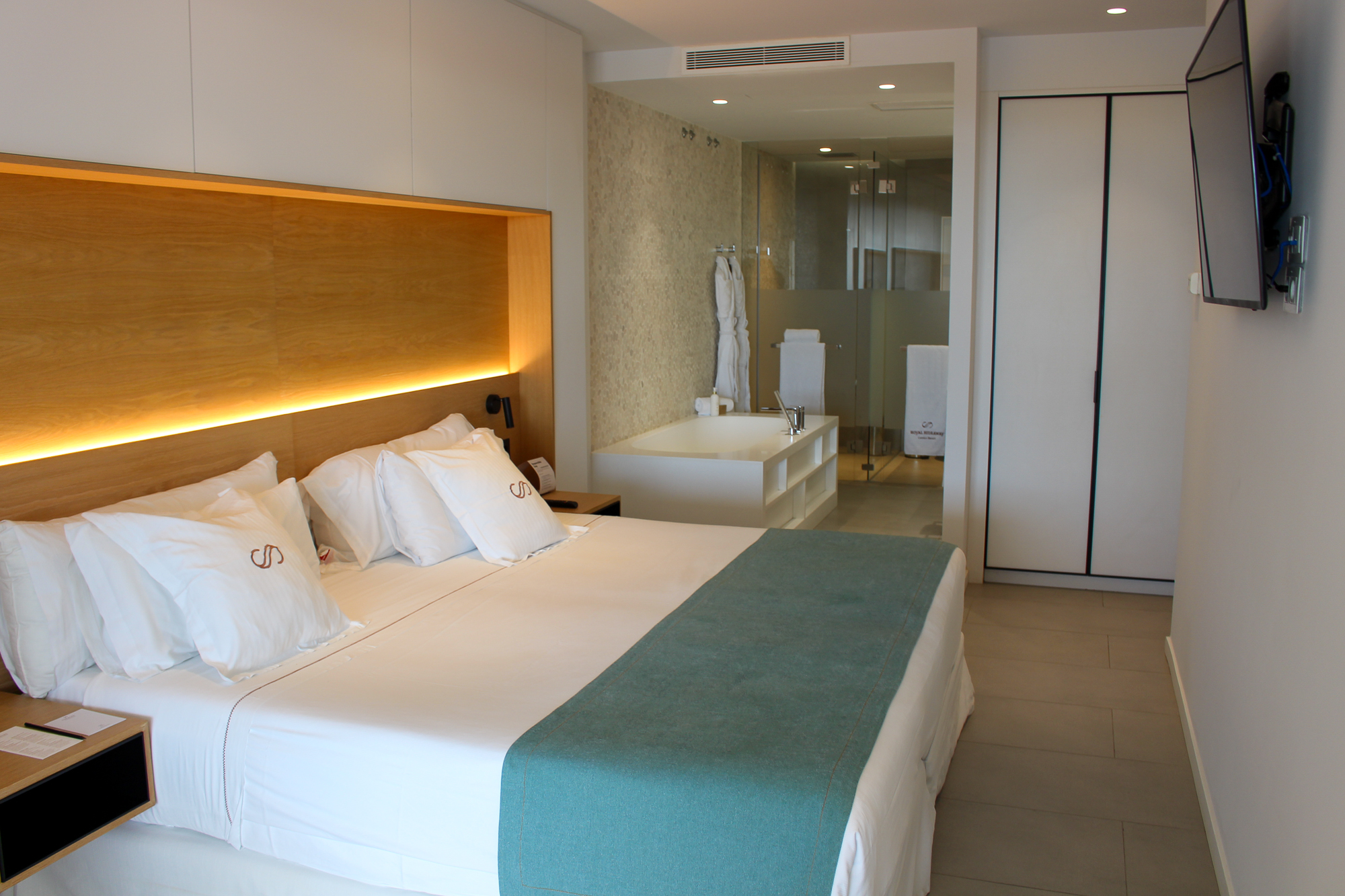 1 bedroom “en suite” with a KING SIZE bed, a KRION bathtub, a very spacious shower and bathroom separated by a large sandblasted screen. A large desk and a 49 “television complete the bedroom.