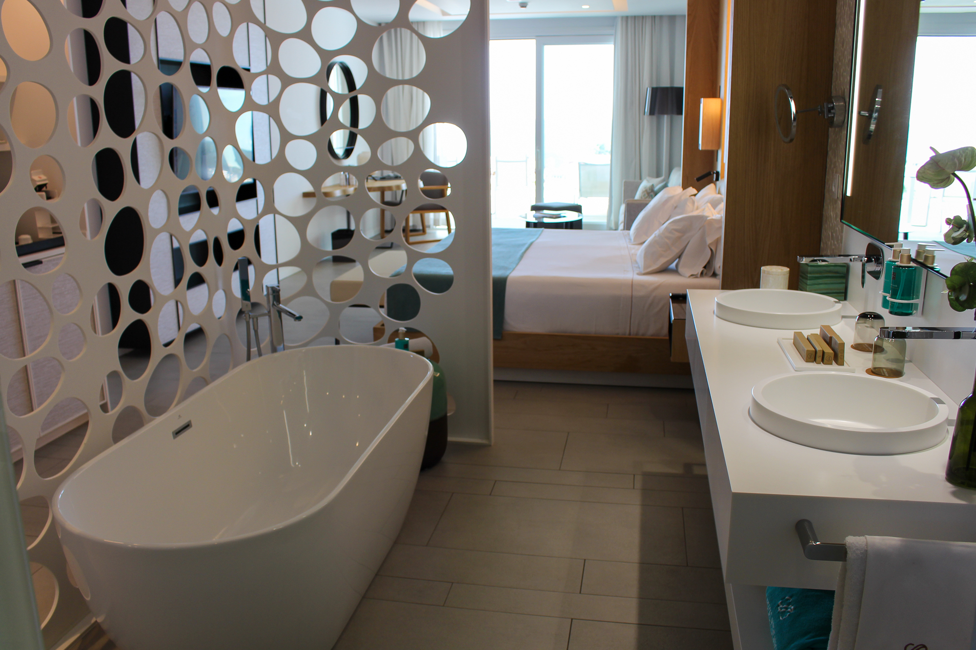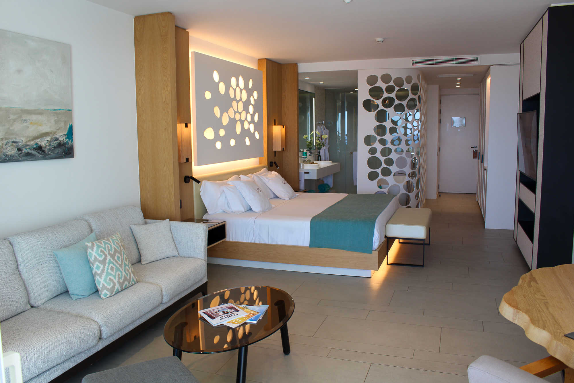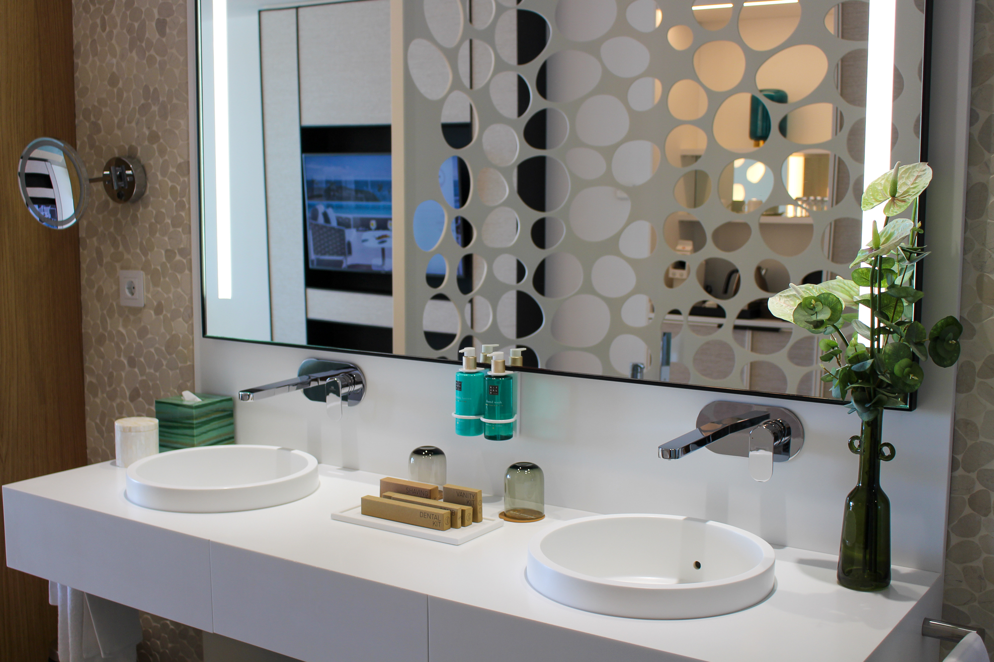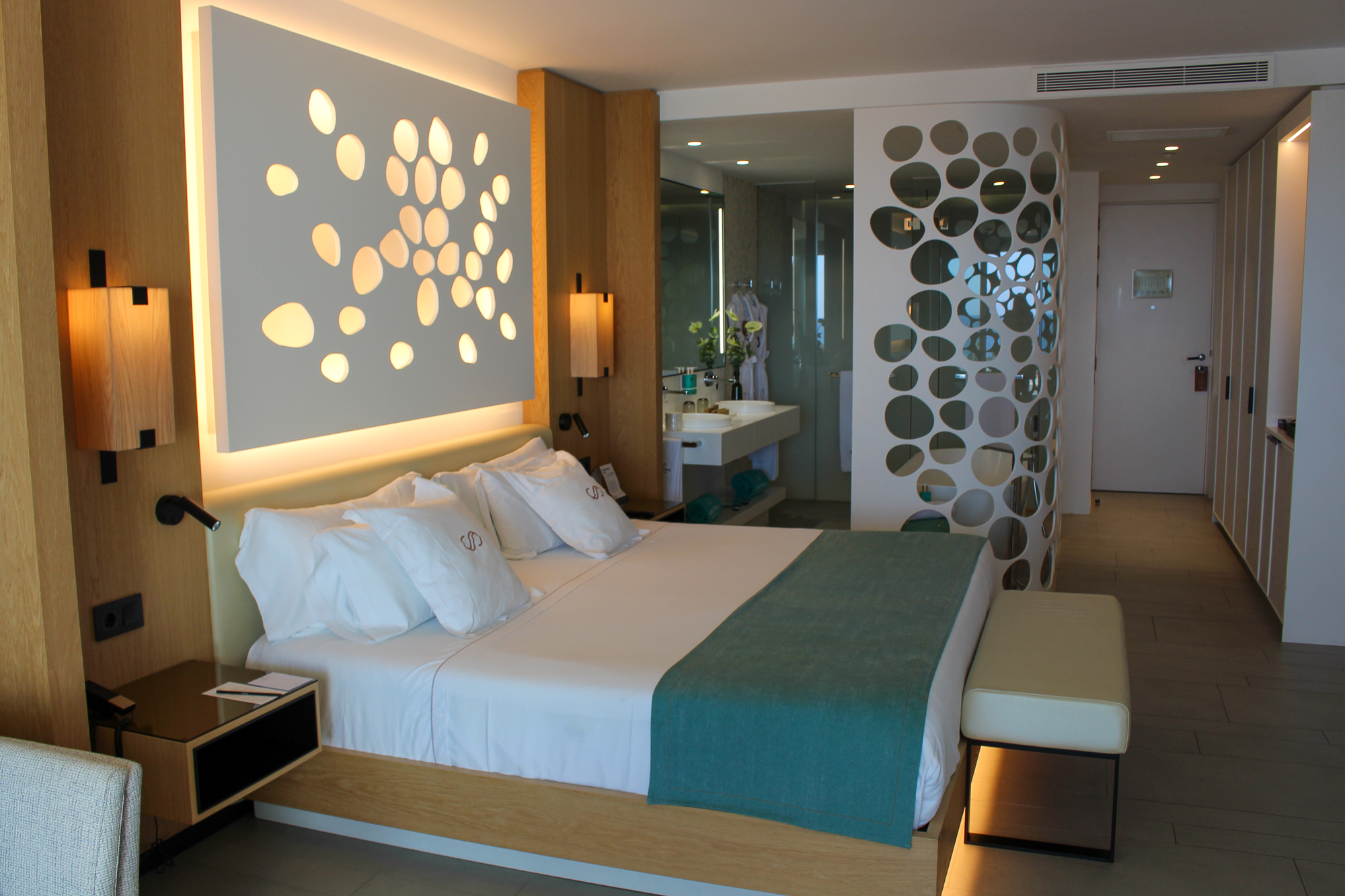 The suites have a large illuminated KING SIZE bed with a nice designed bed board and a very modern bathroom with double sink and bathtub from KRION. Separated rain shower and separate toilet.