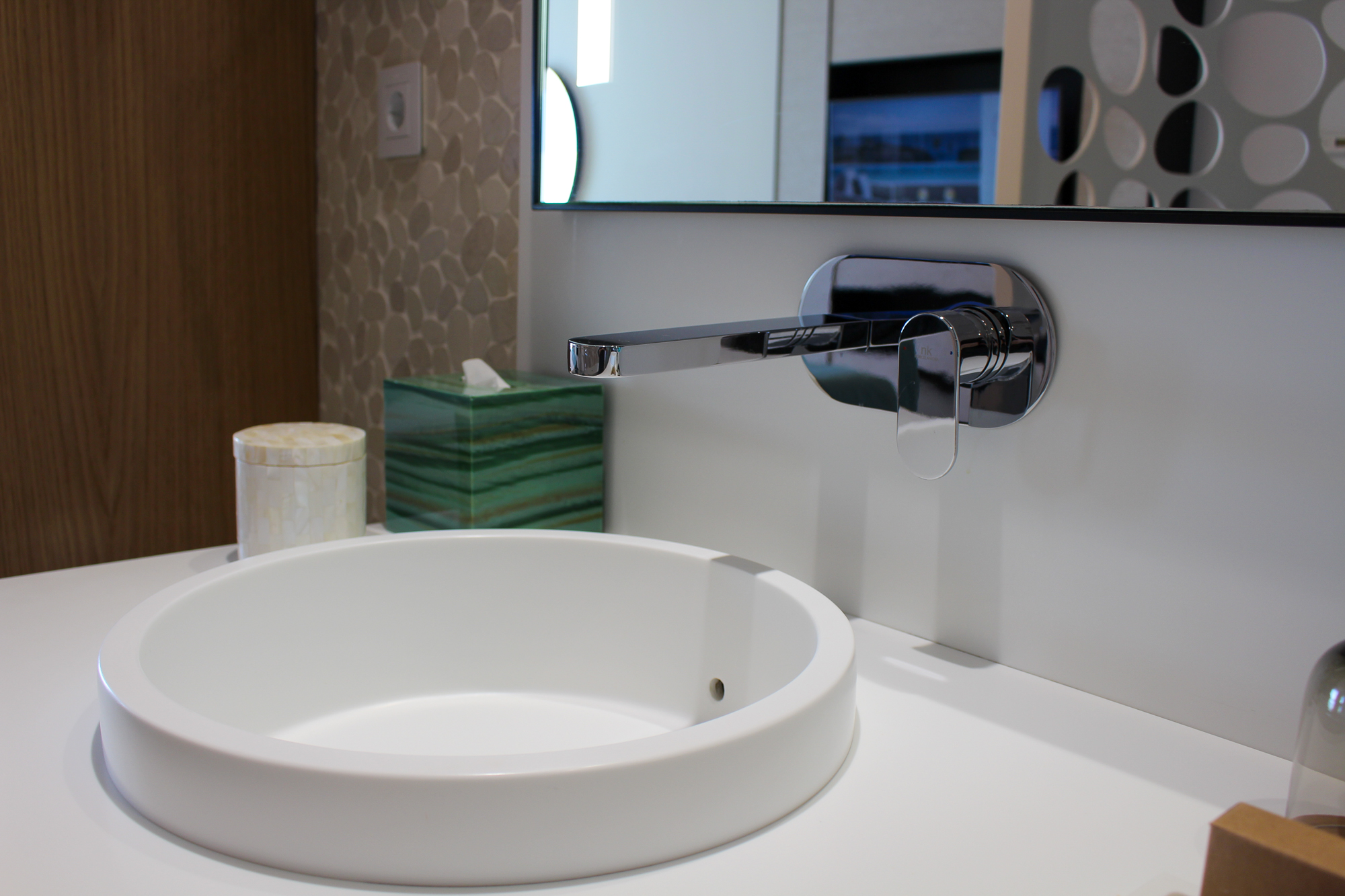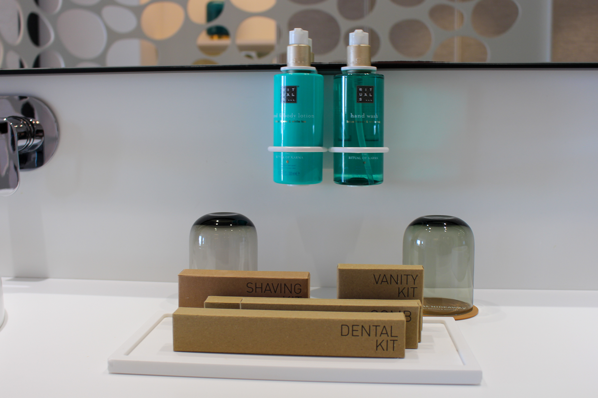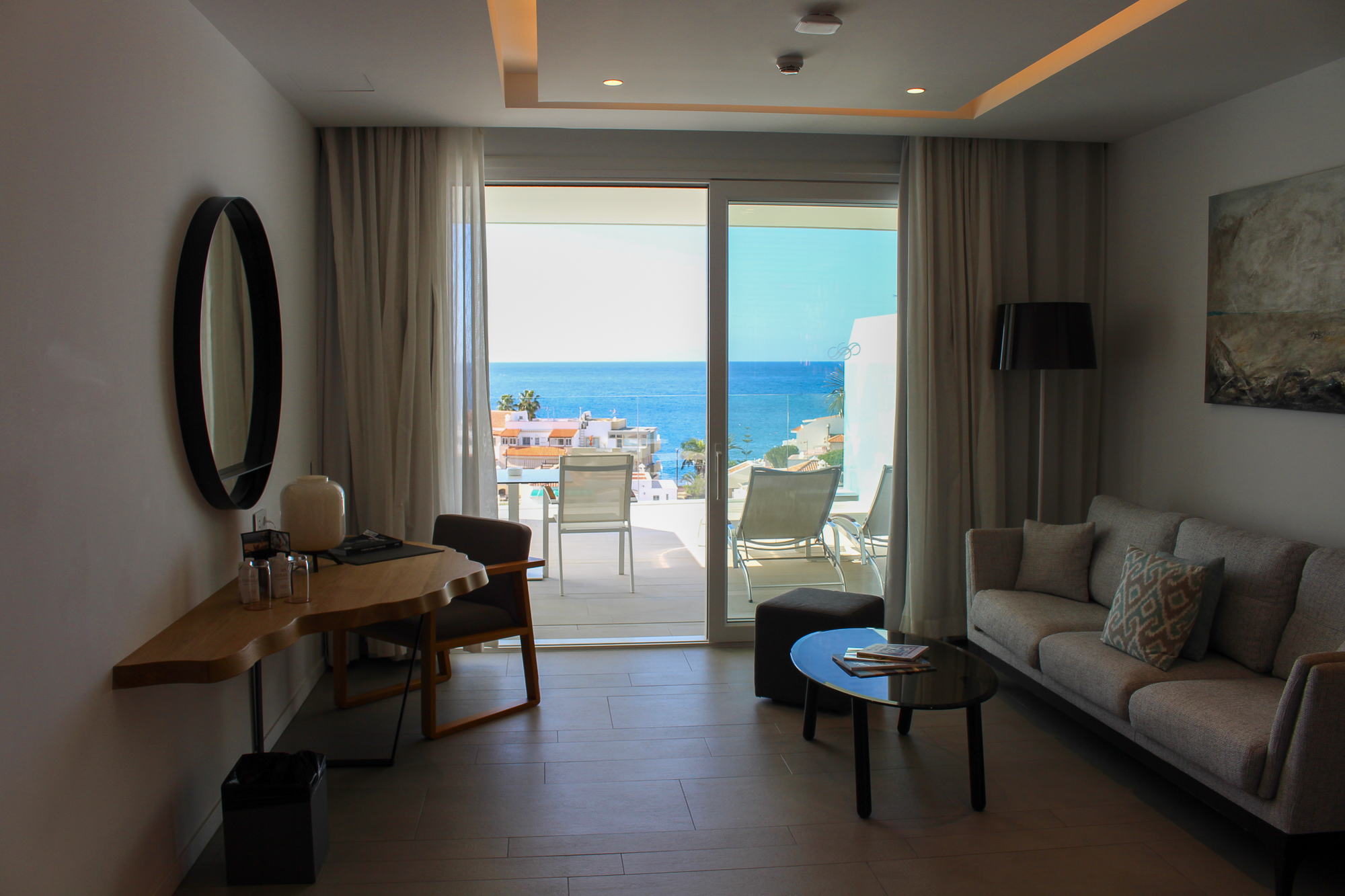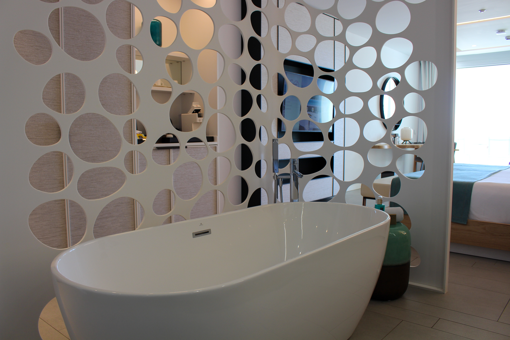 The suites have a large illuminated KING SIZE bed with a nice designed bed board and a very modern bathroom with double sink and bathtub from KRION. Separated rain shower and separate toilet.