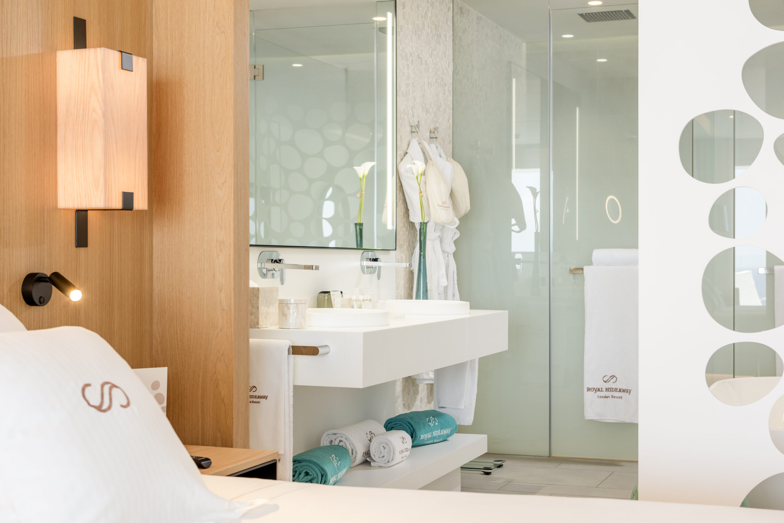 The suites has a large illuminated KING SIZE bed with a nice designed bed board and a very modern bathroom with double sink and bathtub from KRION. Separated rain shower and separate toilet.