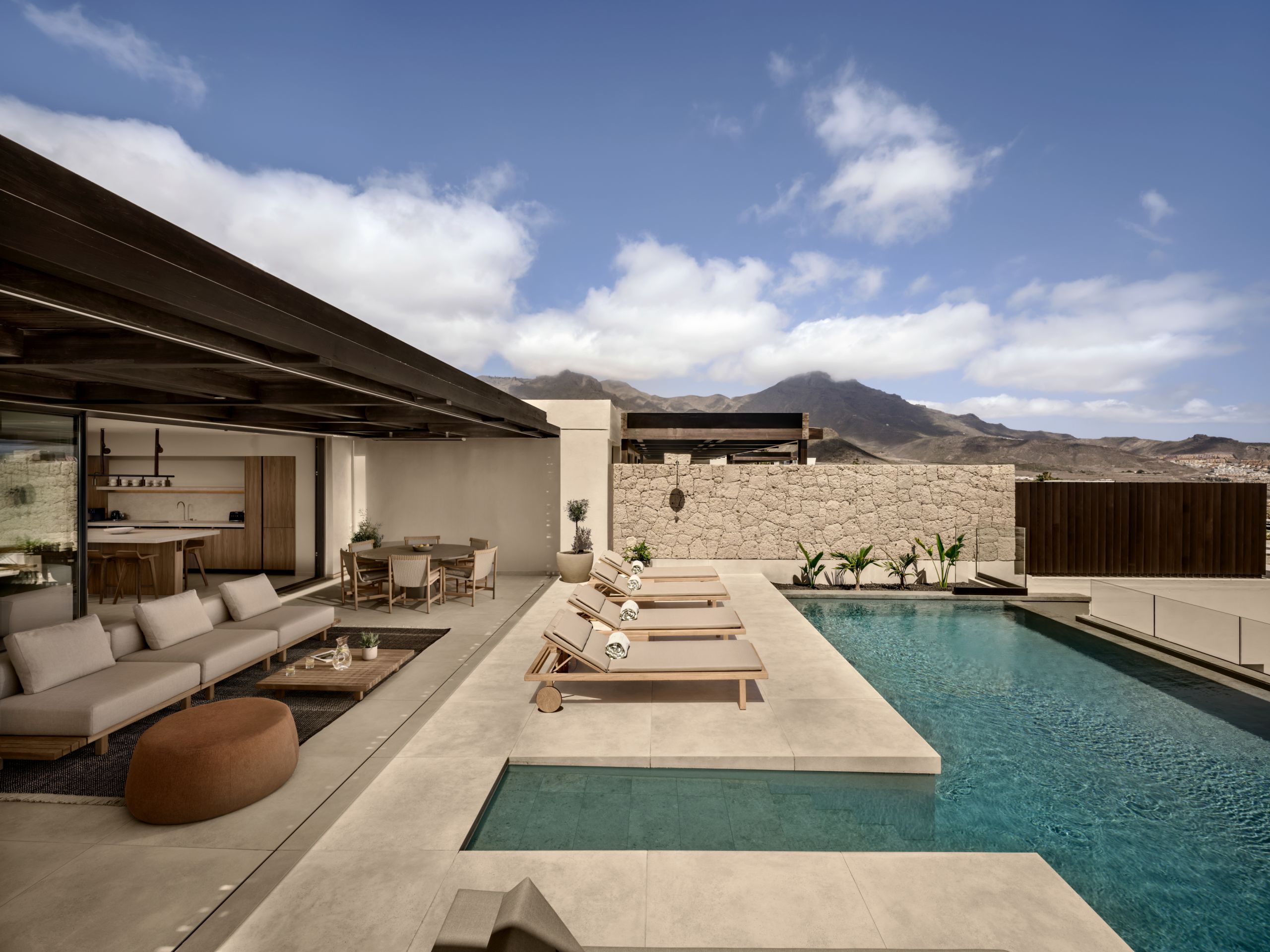 Buitenleven is het hoogtepunt van deze villa. Het uitgestrekte terras is zorgvuldig verdeeld in meerdere zones: een eetgedeelte, een comfortabele lounge met banken en stoelen, en vier ligbedden, perfect om van de zon te genieten. Een overdekt gedeelte met bamboe latten filtert het natuurlijke licht op een zachte manier, waardoor een rustige, schaduwrijke plek ontstaat. In het midden nodigt het privƩ-zwembad in de grond uit voor ontspannen zwempartijen, met volledige privacy en ononderbroken panoramisch uitzicht op de oceaan en het omliggende landschap.